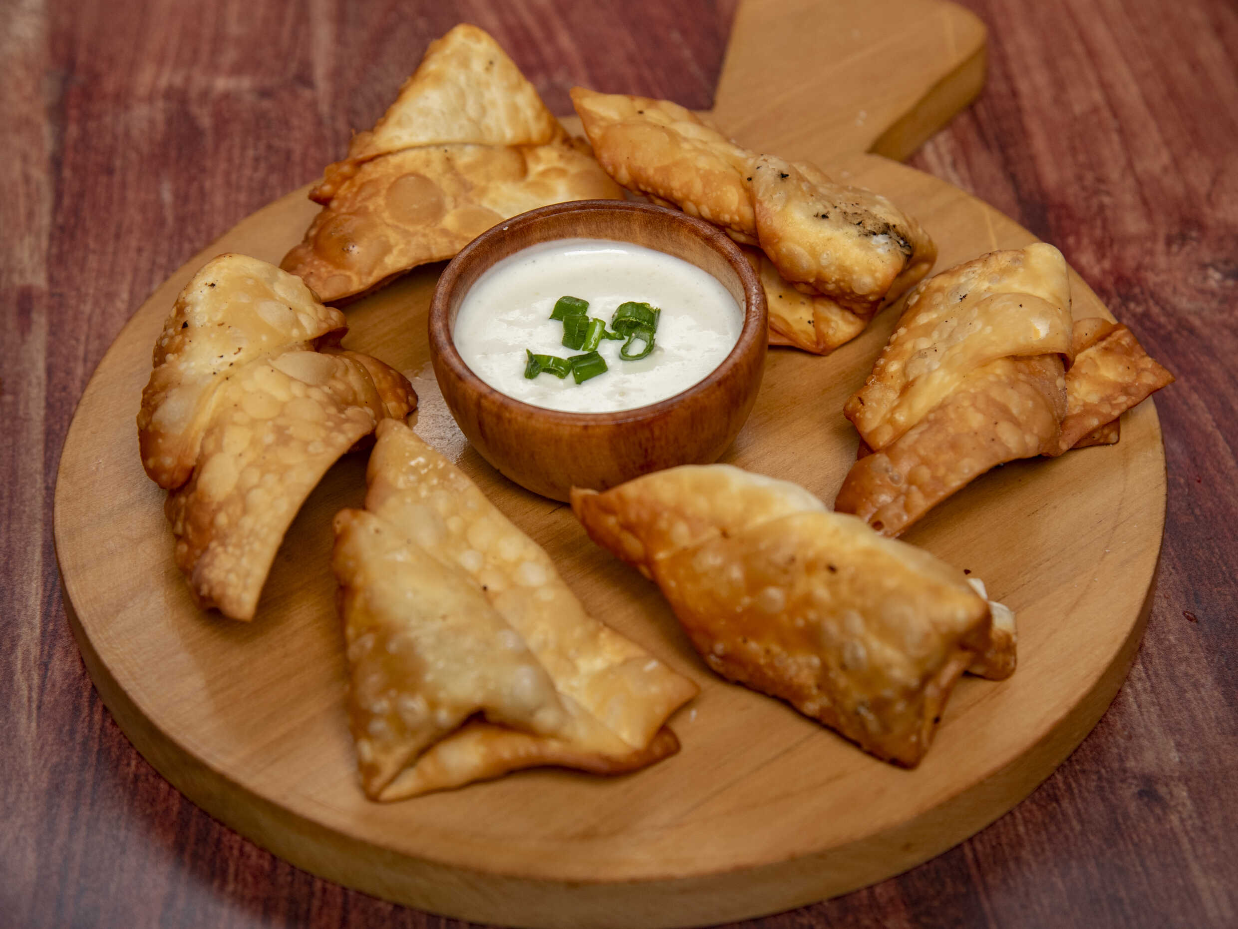 Wantancitos chiferos rellenos de pollo estilo asiático acompañados con salsas a elección.