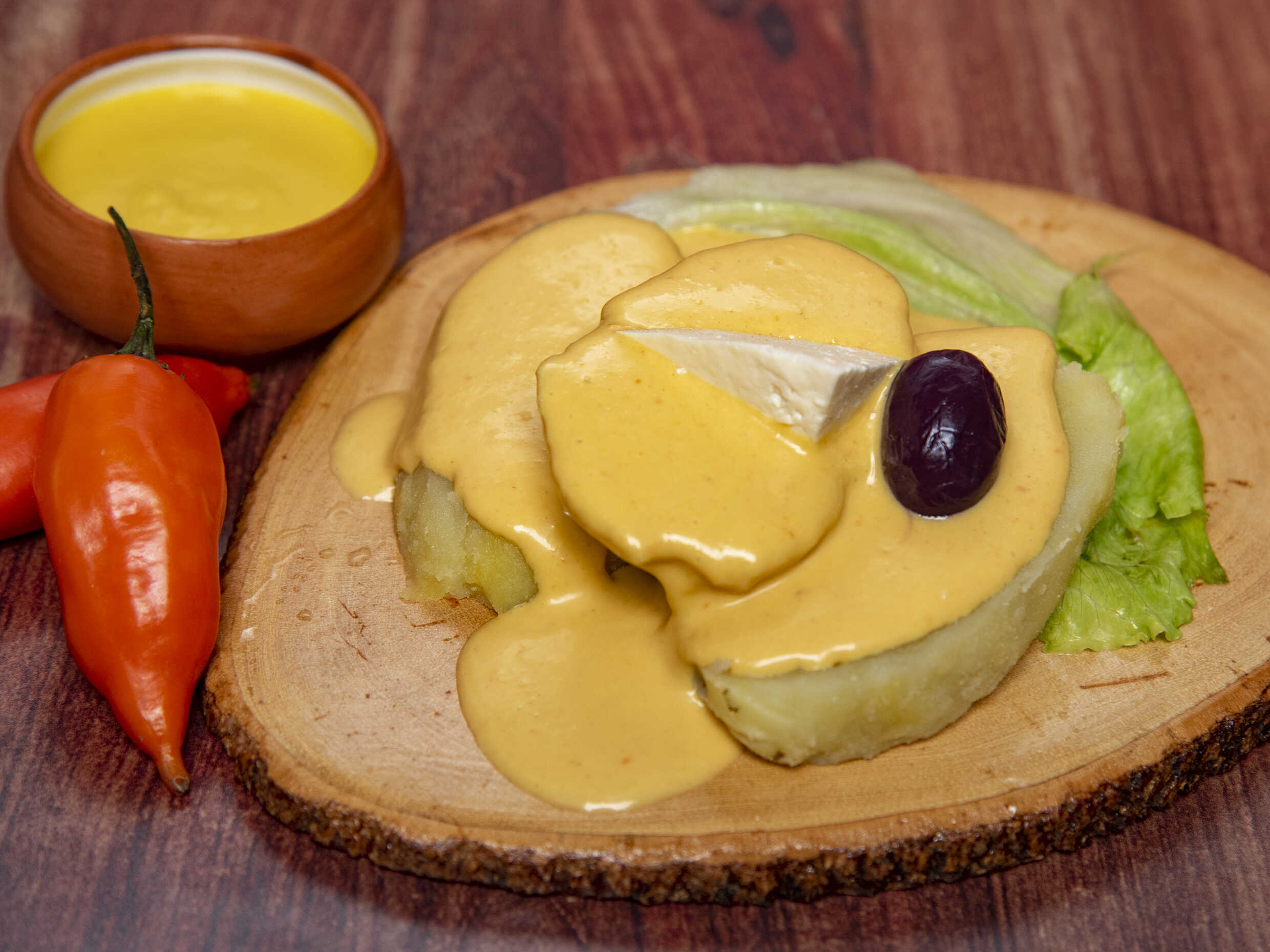 Papas sancochadas bañadas en una cremosa salsa huancaína cremosa.