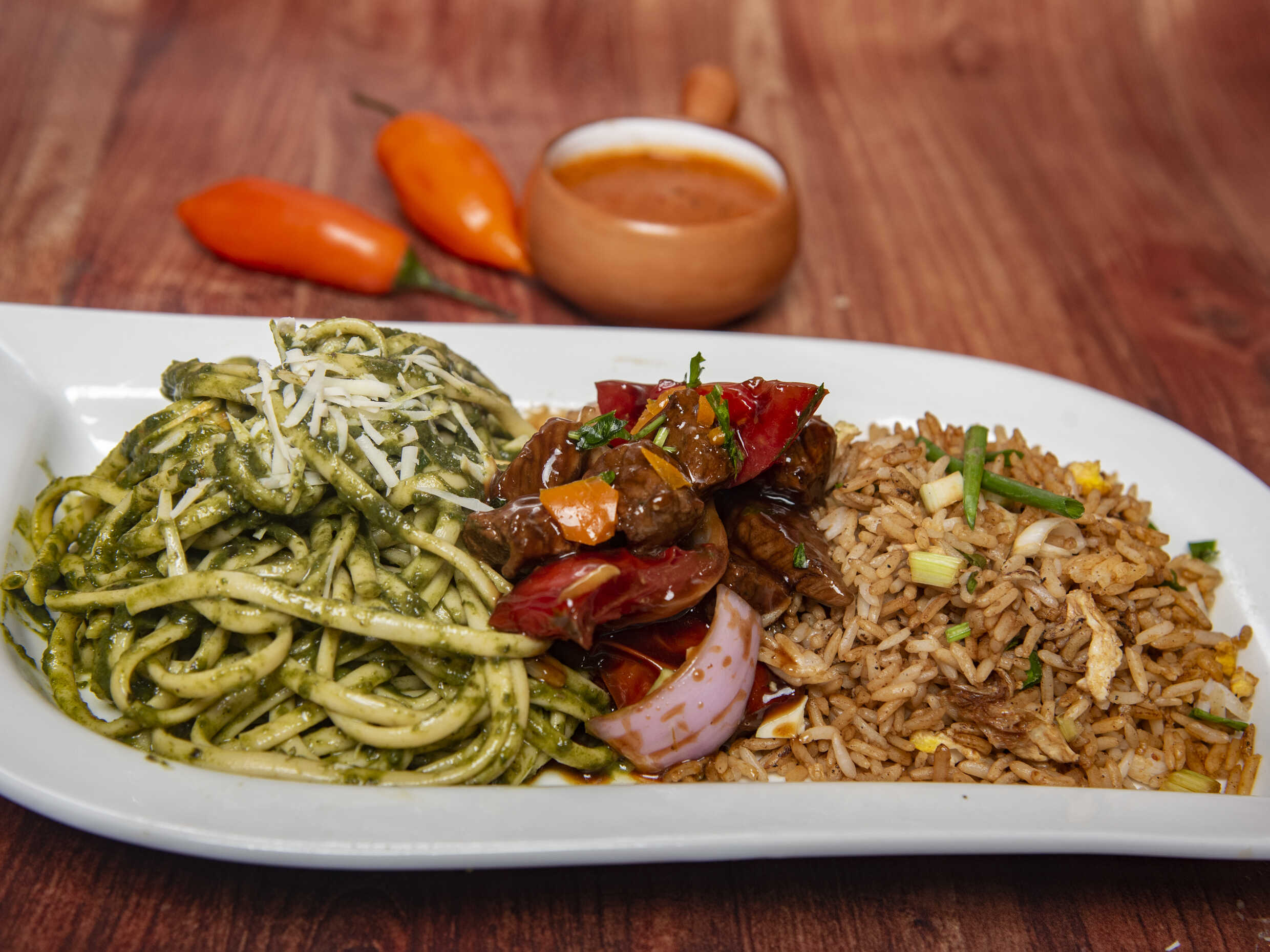 Clásicos tallarines al pesto peruano acompañados con arrocito chaufa y tierno lomito saltado al wok.