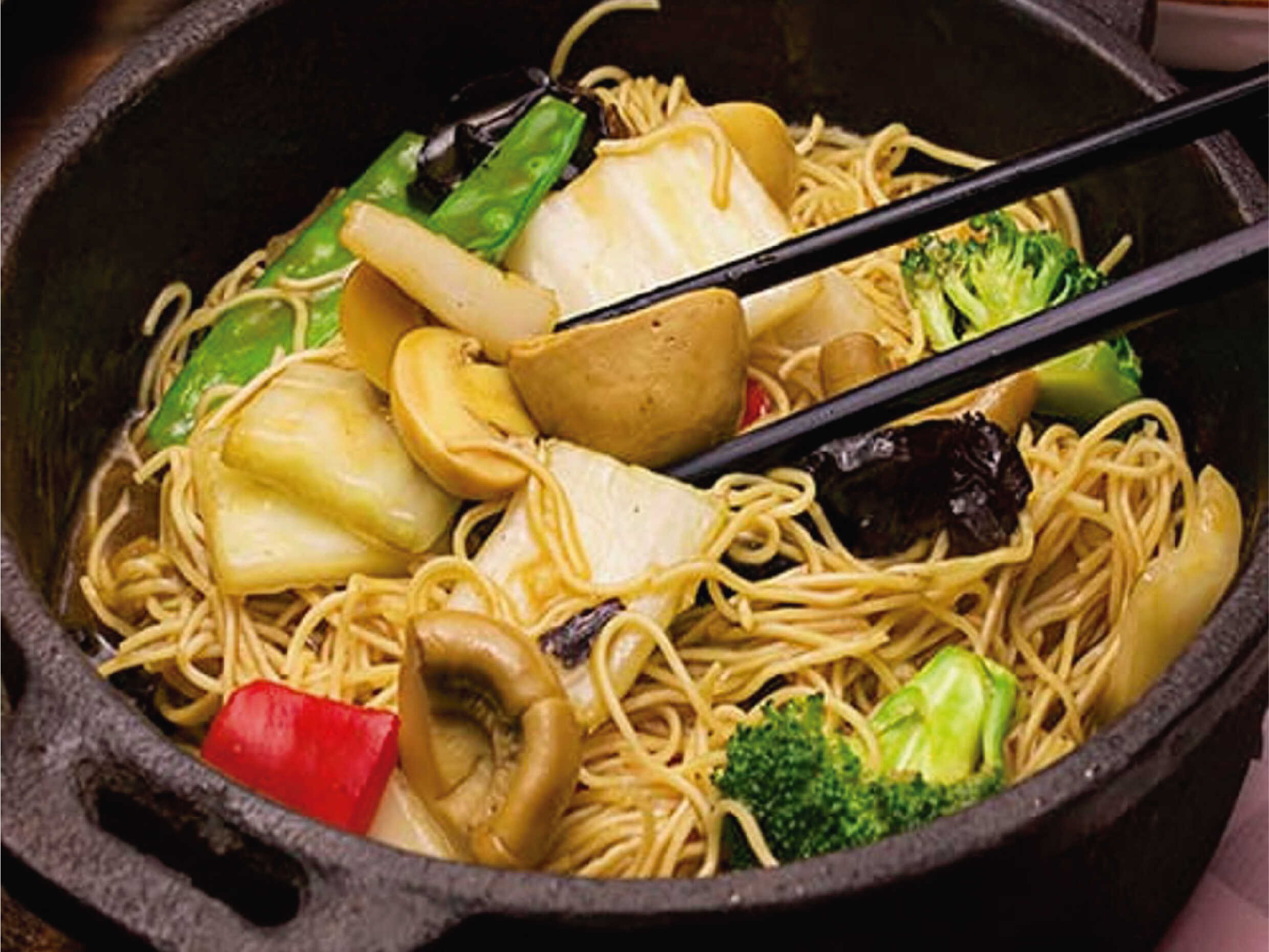 Tallarín vegetariano con champiñones, col china, pimiento, cebolla, holantao, brócoli y champiñones.