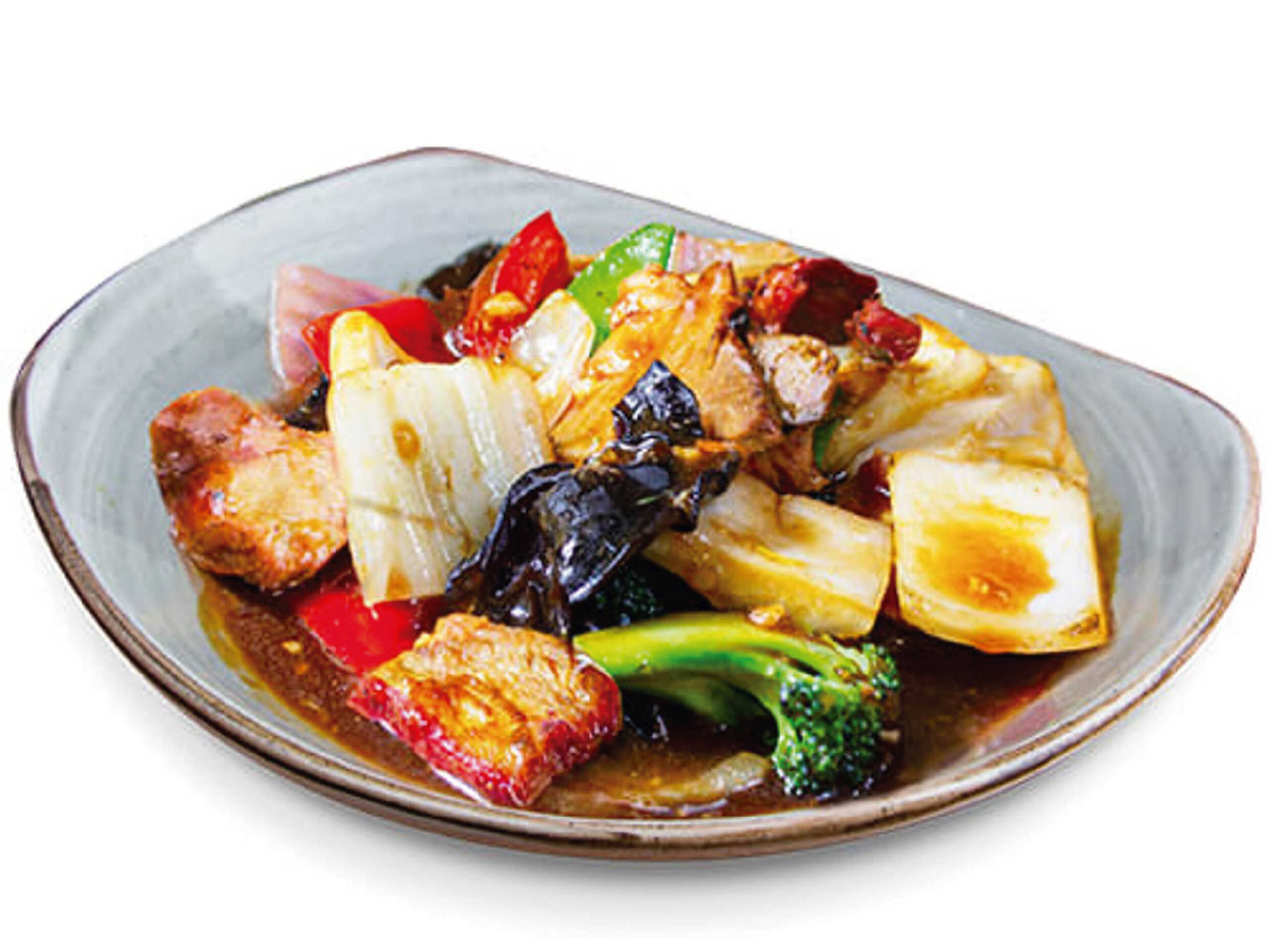 Láminas salteadas de chancho asado con verduras y salsa ostión.