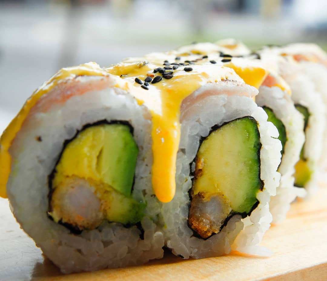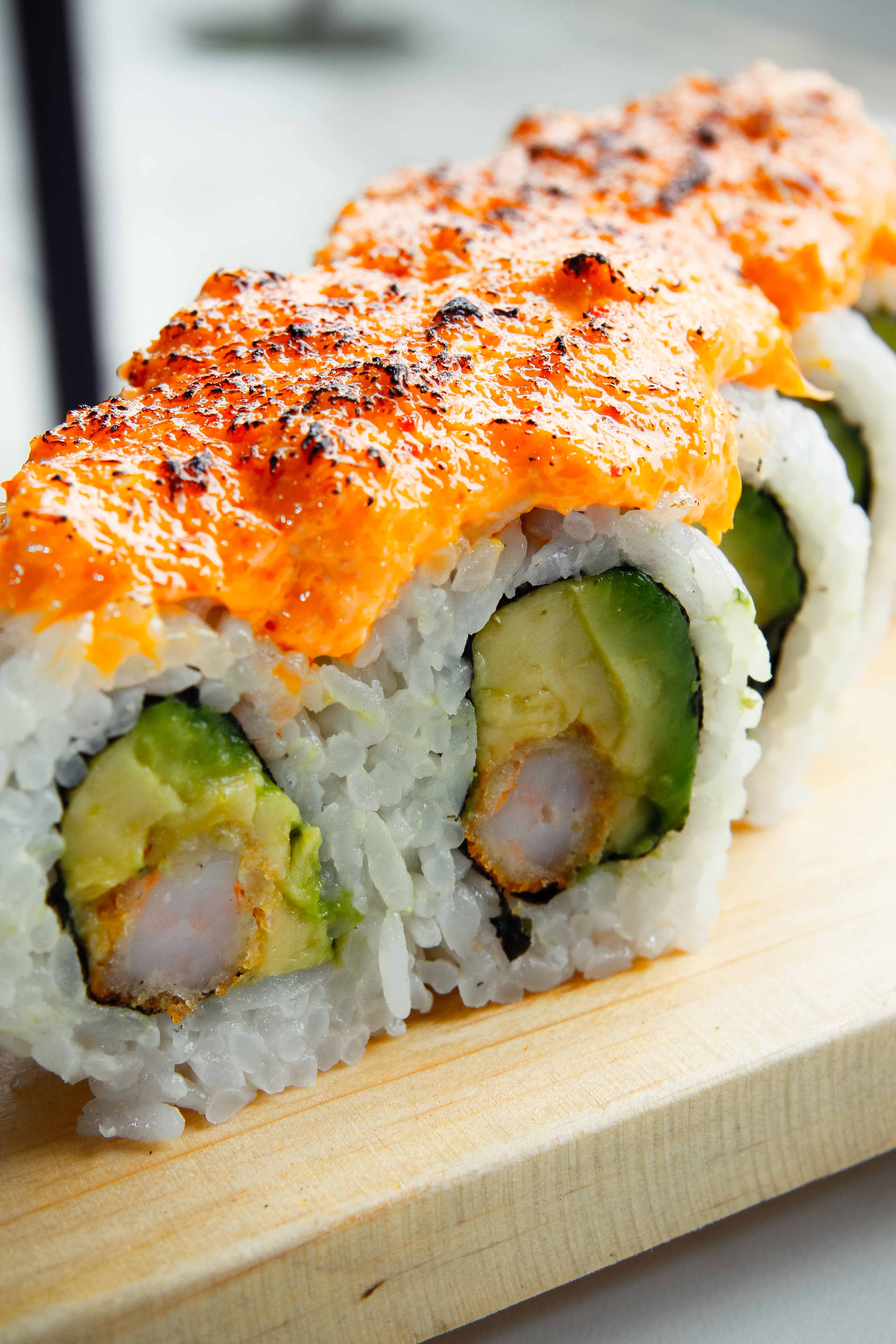 Relleno de langostino empanizado y palta, cubierto de crema tokio flameada.