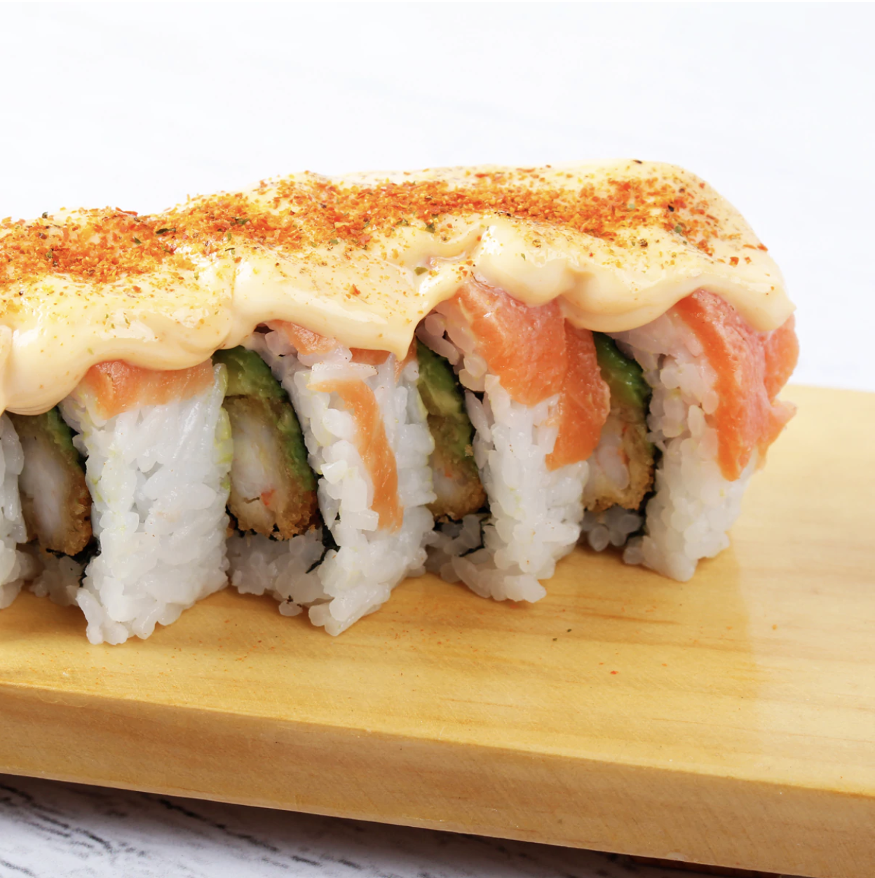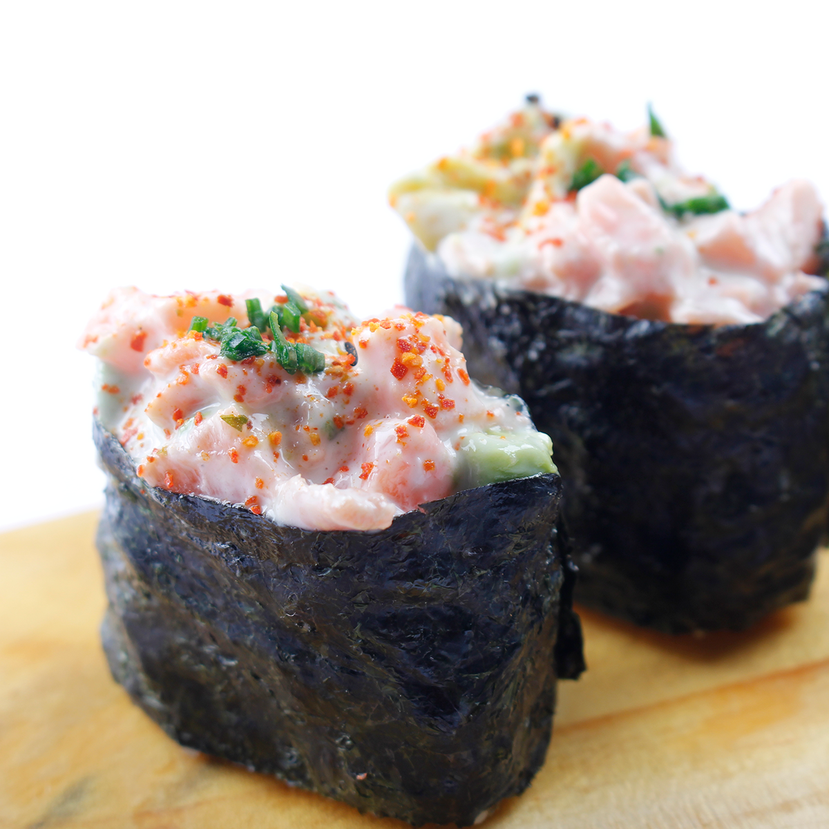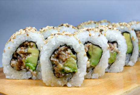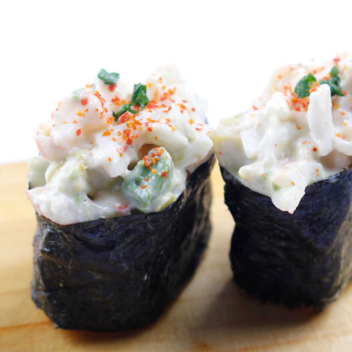 Pulpa mix mezclado con mayonesa, aceite de ajonjolí, especias japonesas, moldes pequeños de shari enrollado de alga nori.