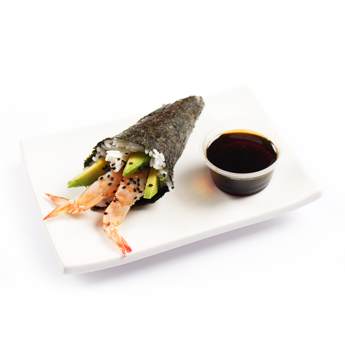 Cono de alga nori relleno de shari con palta, queso crema, langostino cocido y ajonjolí negro.