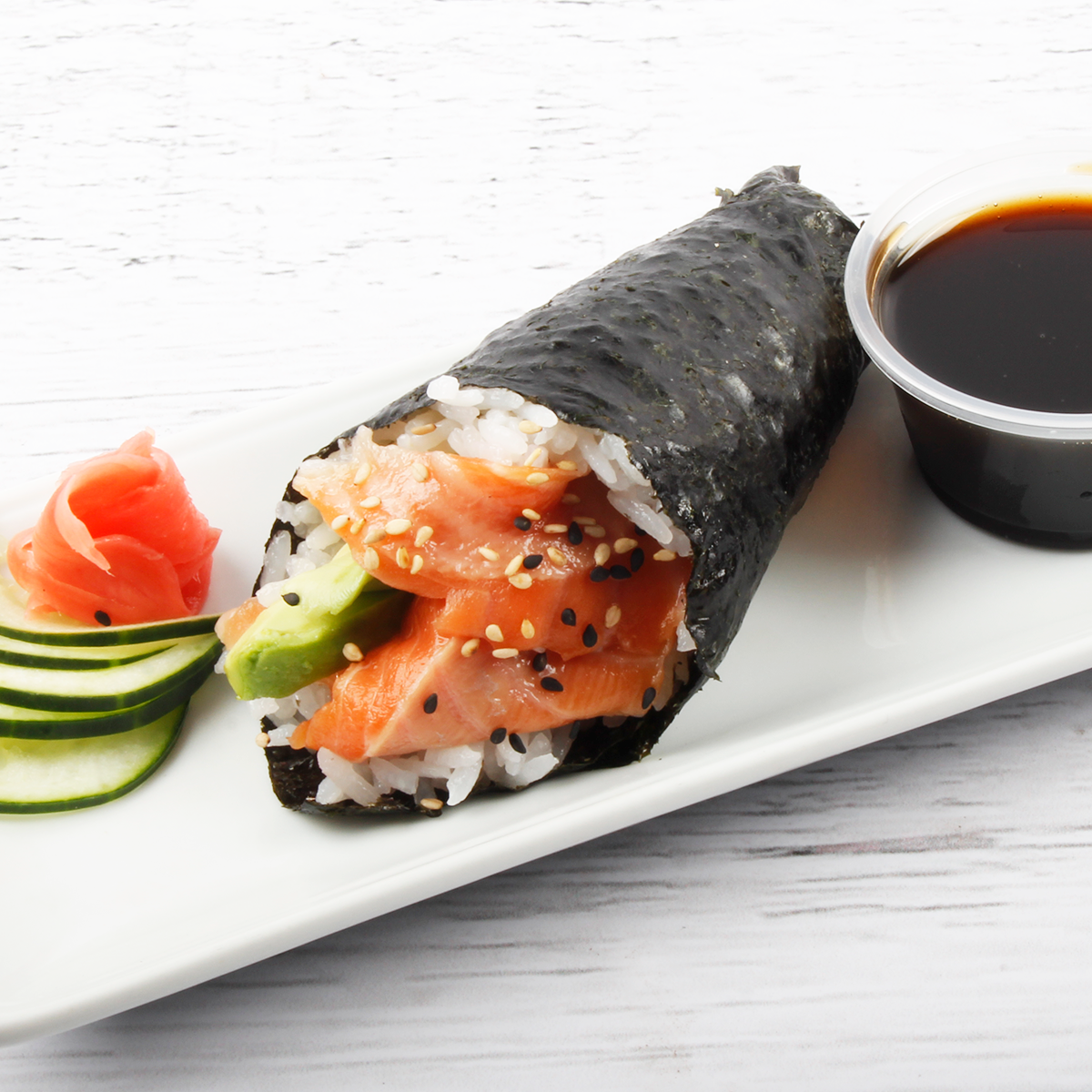 Cono de alga nori relleno de shari, palta y trucha con ajonjolí mixto.