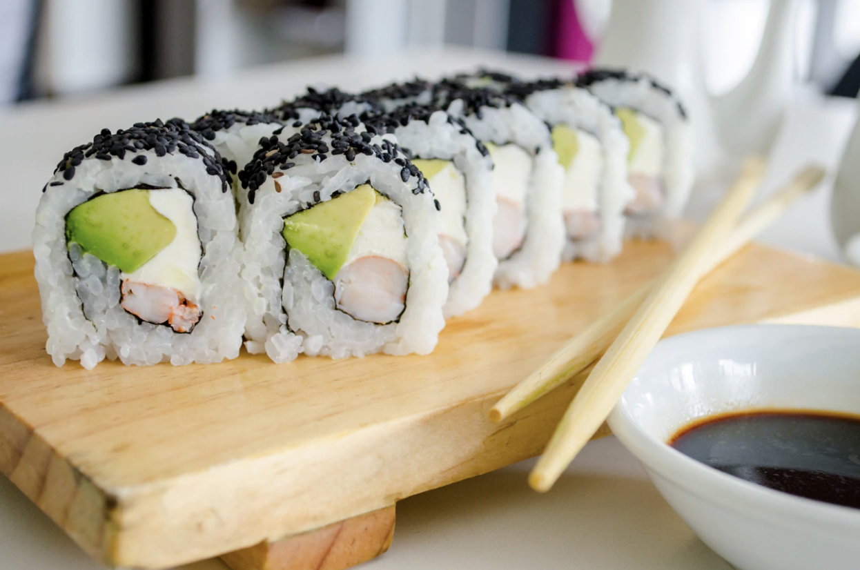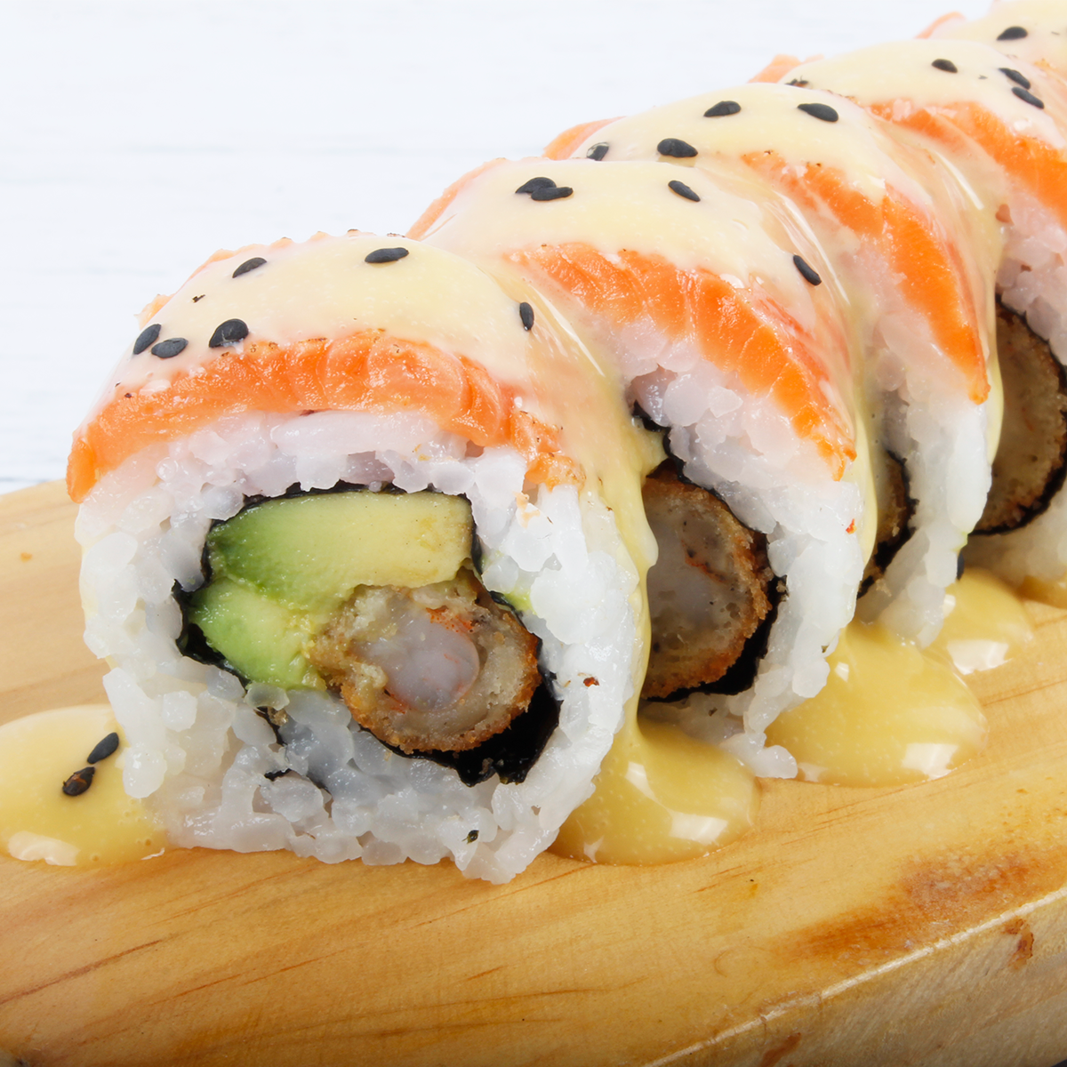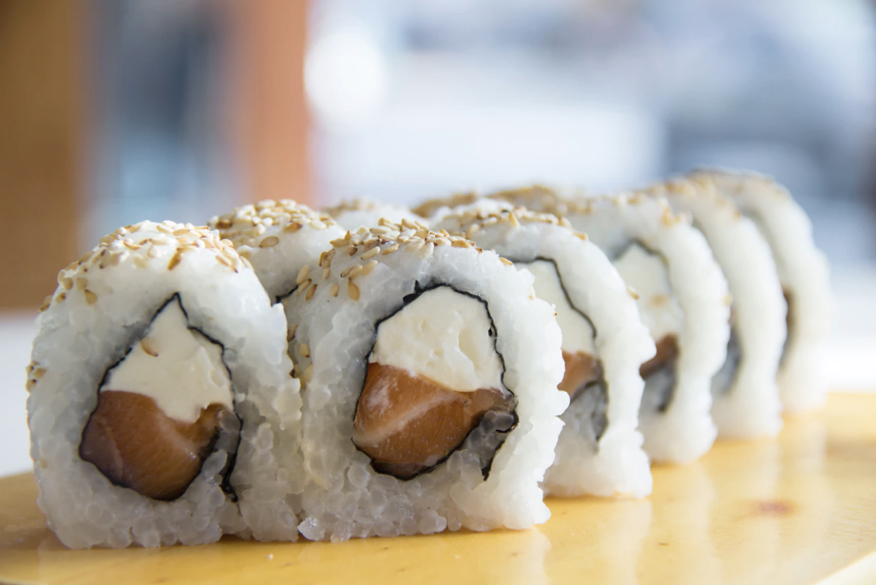 Relleno de langostino cocido, queso Philadelphia y palta, cubierto de ajonjolí negro tostado.