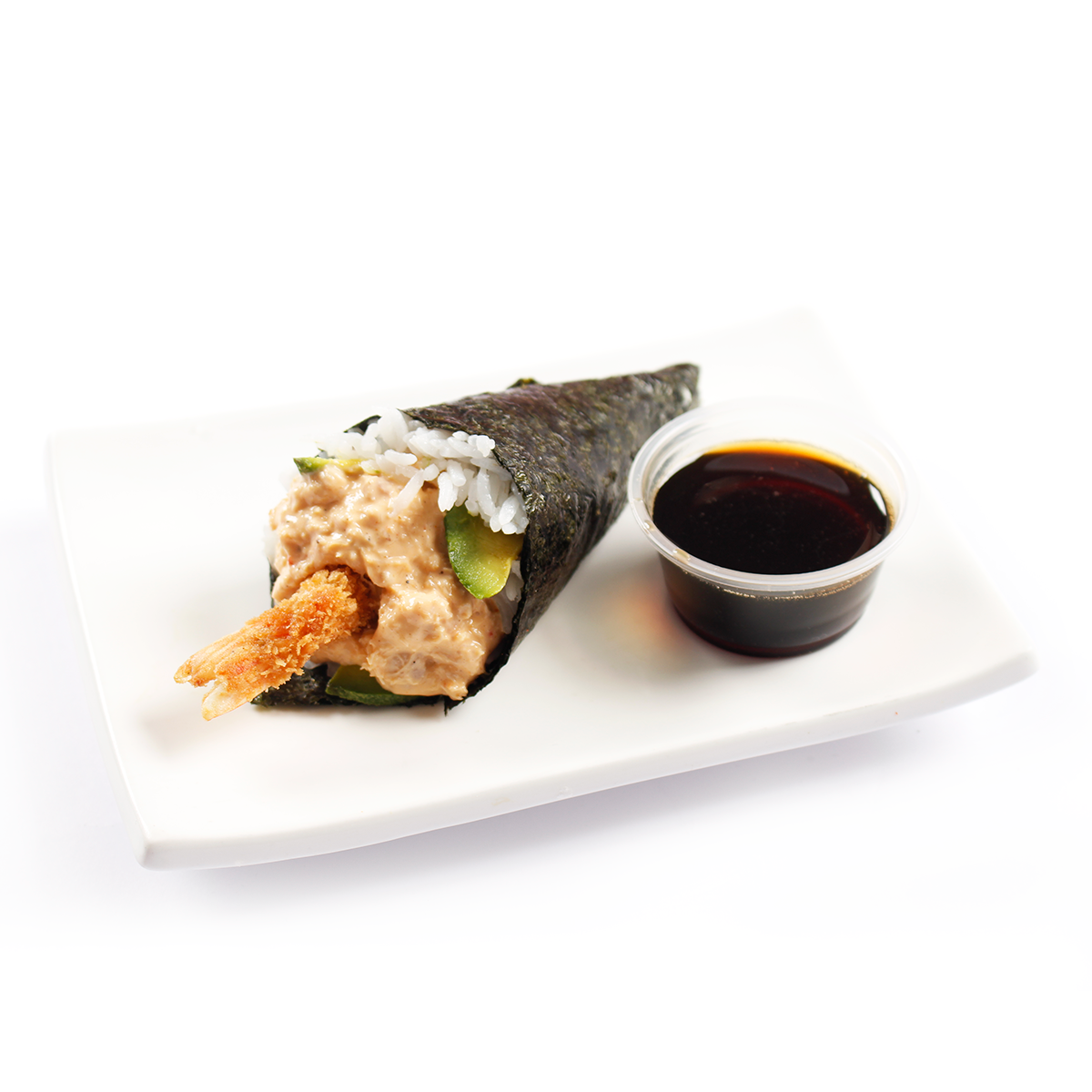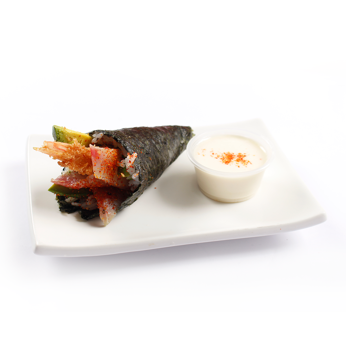 Cono de alga nori relleno de shari, langostino empanizado, palta y crema de salsa tokio (pescado y kani) flameado.