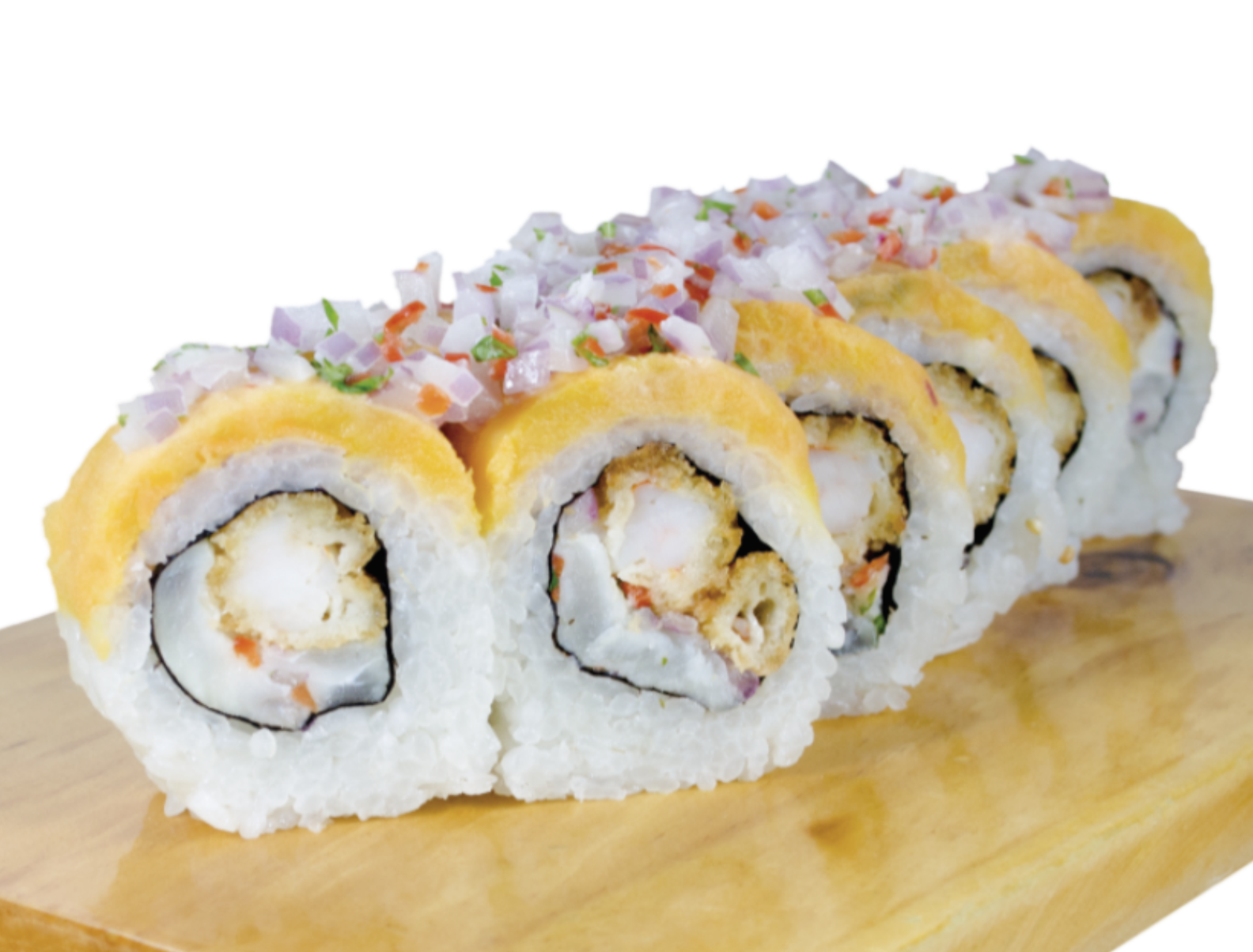 Relleno de langostino empanizado y palta, cubierto de finas láminas de pescado blanco , acompañado de salsa acevichada y togarashi.