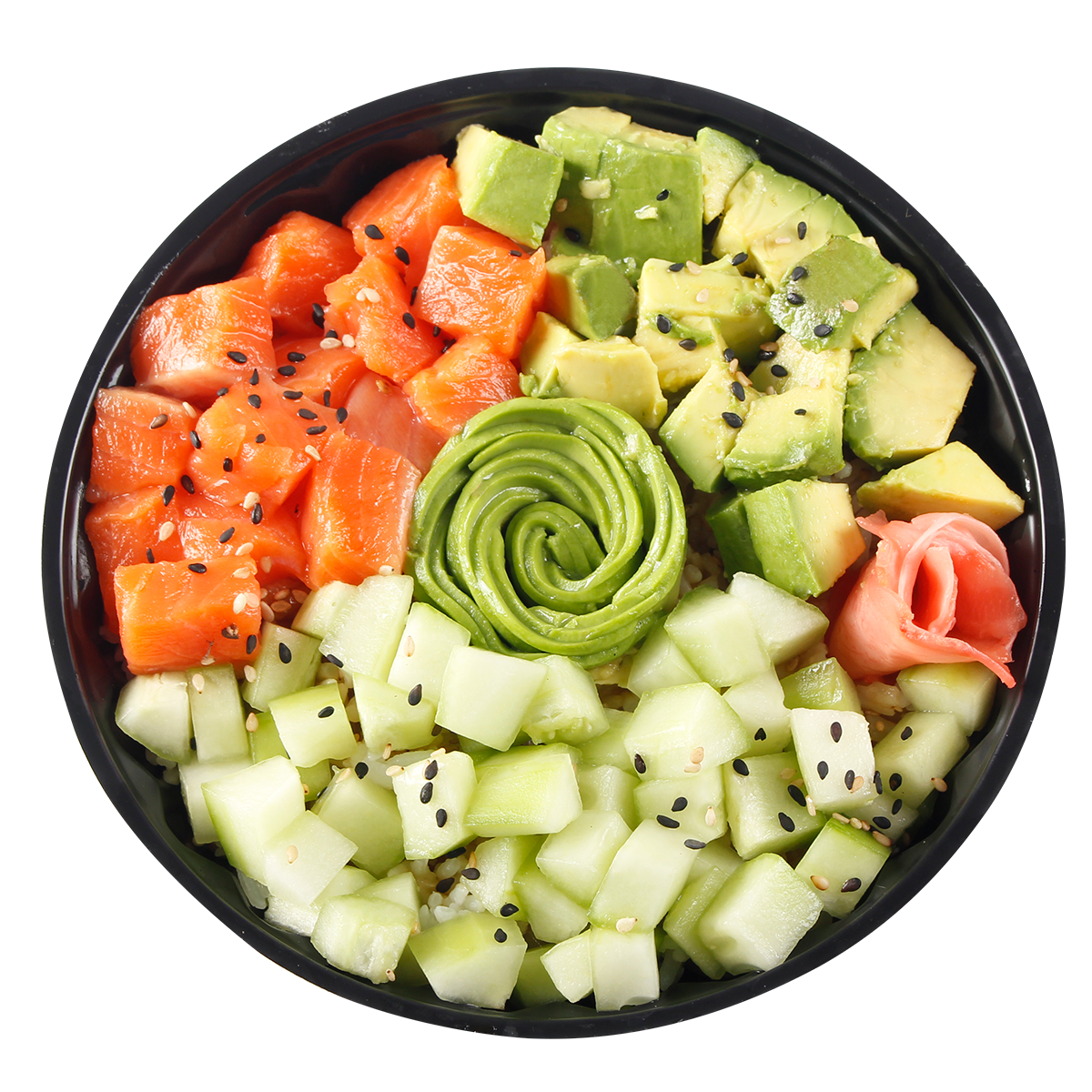 Bowl con base de arroz de sushi bañado en salsa de ostión, semillas de ajonjolí, topping de palta, pescado y kiuri picado.