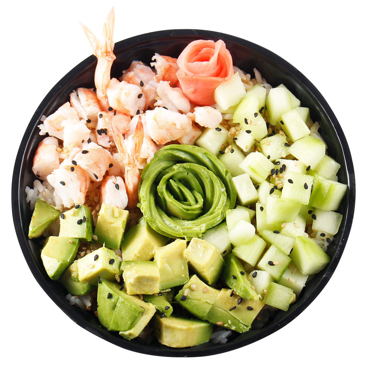 Bowl con base de arroz de sushi bañado en salsa de ostión, semillas de ajonjolí, topping de palta, langostino y kiuri picado.