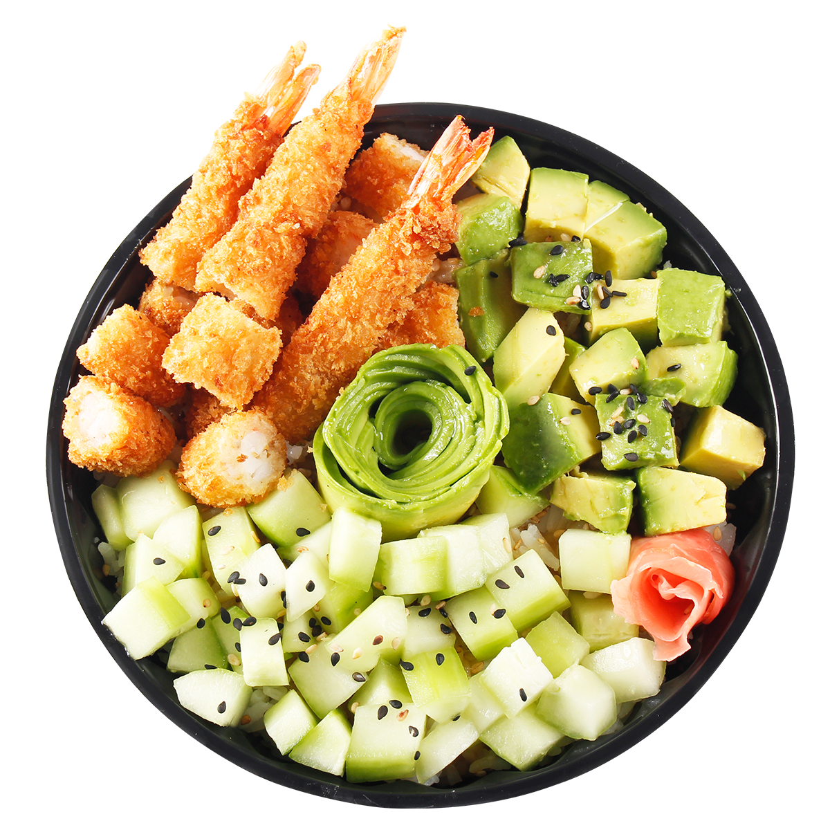 Bowl con base de arroz de sushi bañado en salsa de ostión, semillas de ajonjolí, topping de palta, langostino frito y kiuri picado.