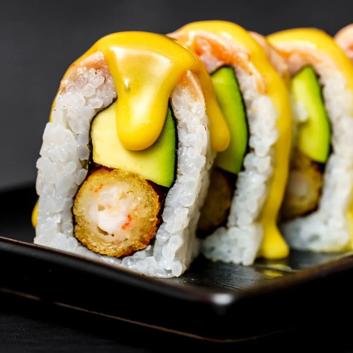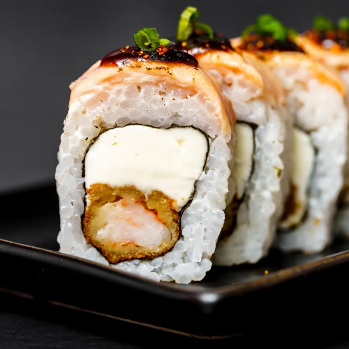 Relleno de langostino empanizado y palta, cubierto de crema tokio flameada. (10 unidades)