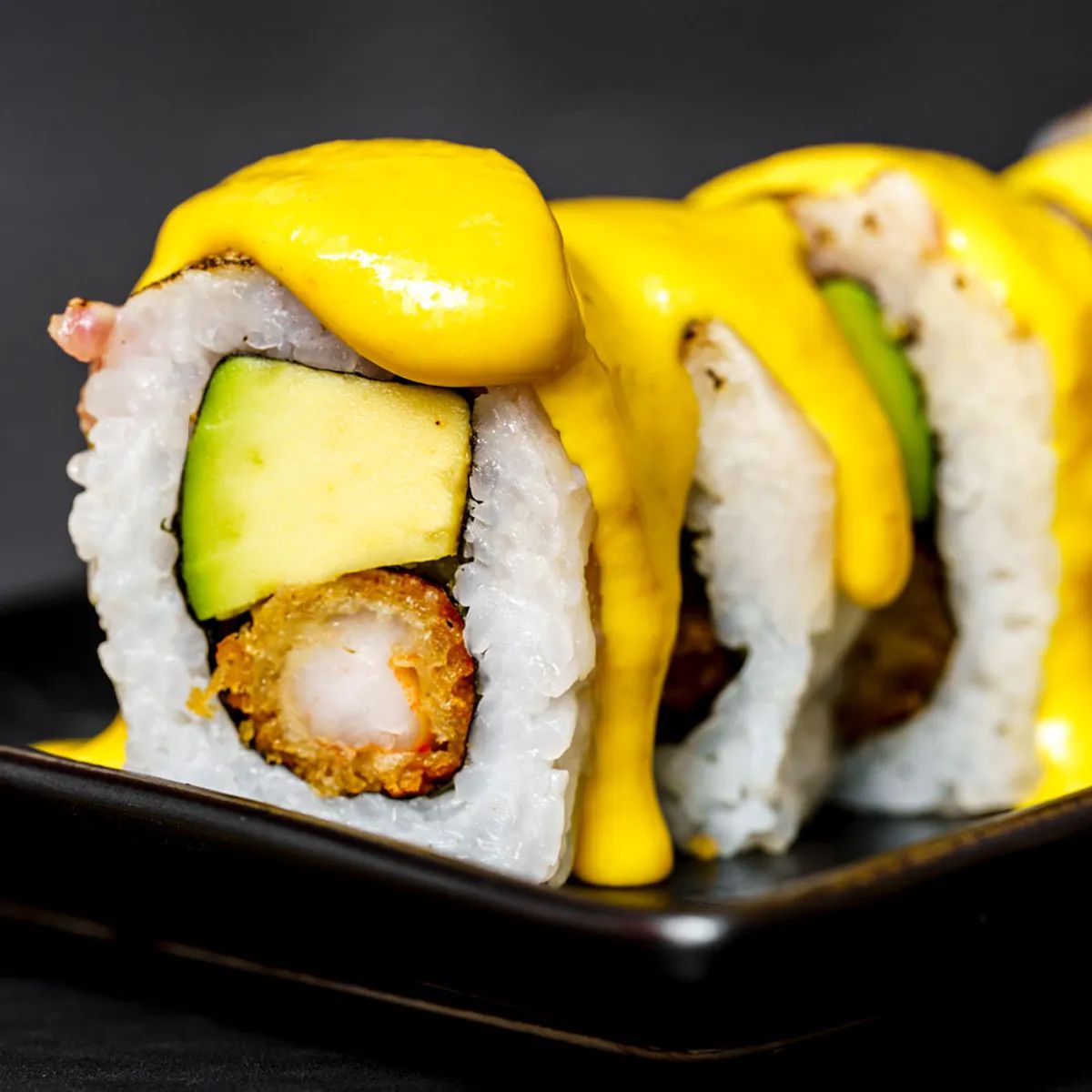 Relleno de langostino empanizado y palta, cubierto con pescado blanco flameado y bañado en salsa huancaína con ajonjolí negro. (10 unidades)