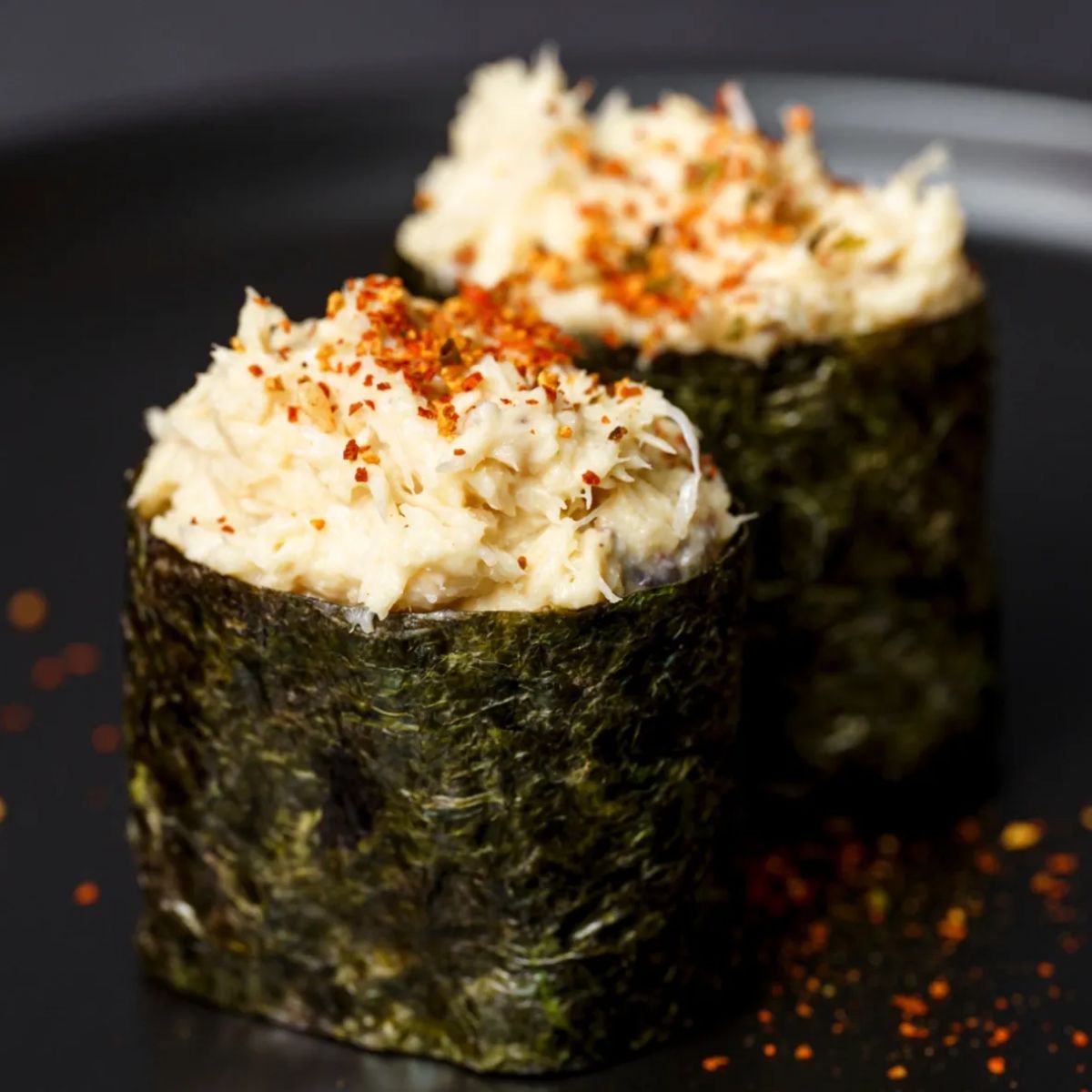 Pulpa mix mezclado con mayonesa, aceite de ajonjoli, especies japonesas, moldes pequeños de shari enrollado de alga nori.