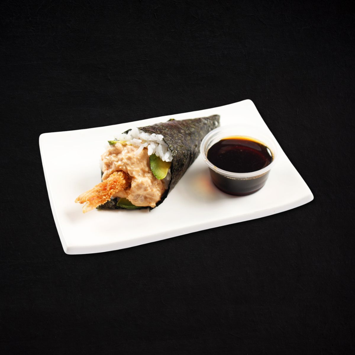 Cono de alga nori relleno de shari, langostino empanizado, palta y crema de salsa tokio (pescado y Kani) flameado.