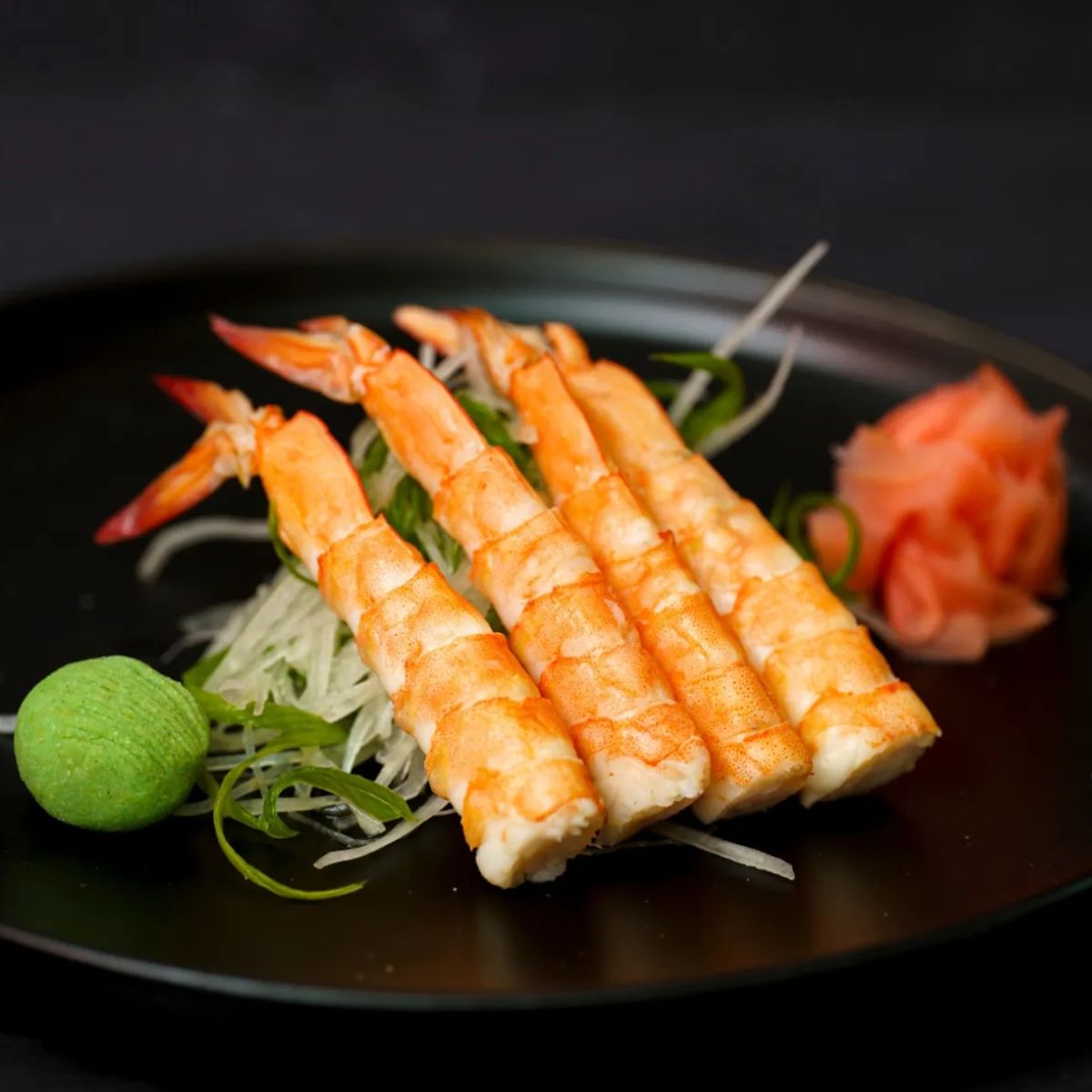 Tartar de langostino cocido con palta en salsa acevichada en moldes pequeños de shari enrollado de alga nori.