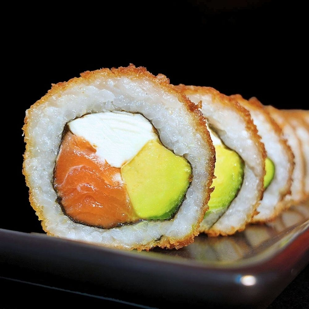 Relleno de langostino cocido, queso philadelphia y palta, cubierto de ajonjolí negro tostado.