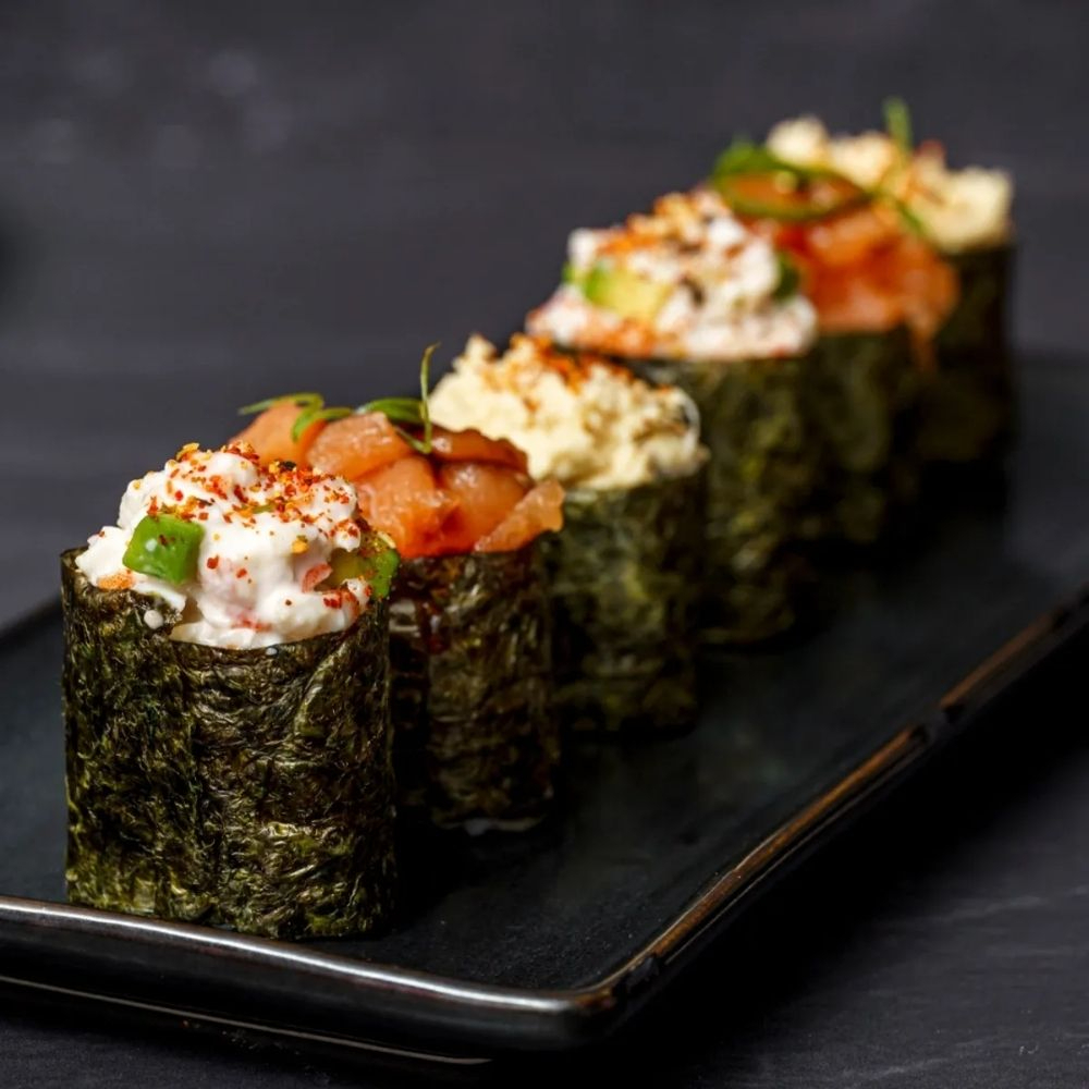 Pulpa mix mezclado con mayonesa, aceite de ajonjoli, especies japonesas, moldes pequeños de shari enrollado de alga nori.