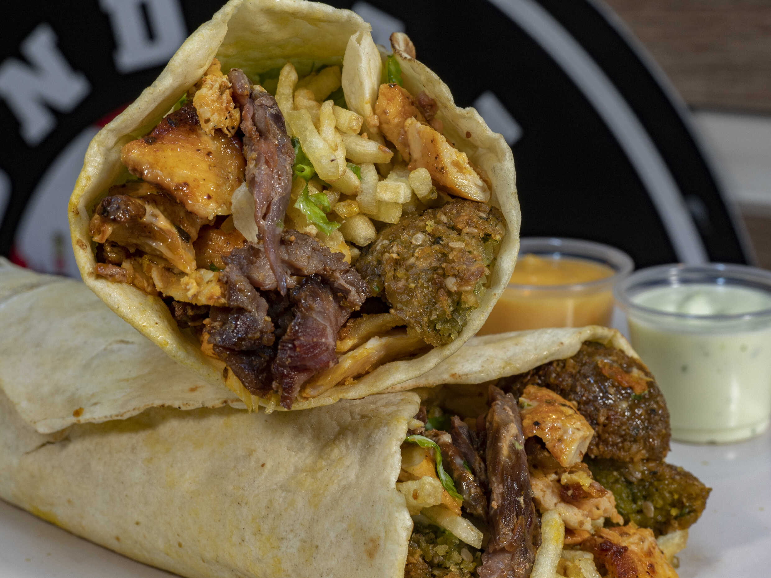 Shawarma con trozos de carne y pollo, papitas al hilo, ensalada y salsa de ajo y pimiento caramelizado