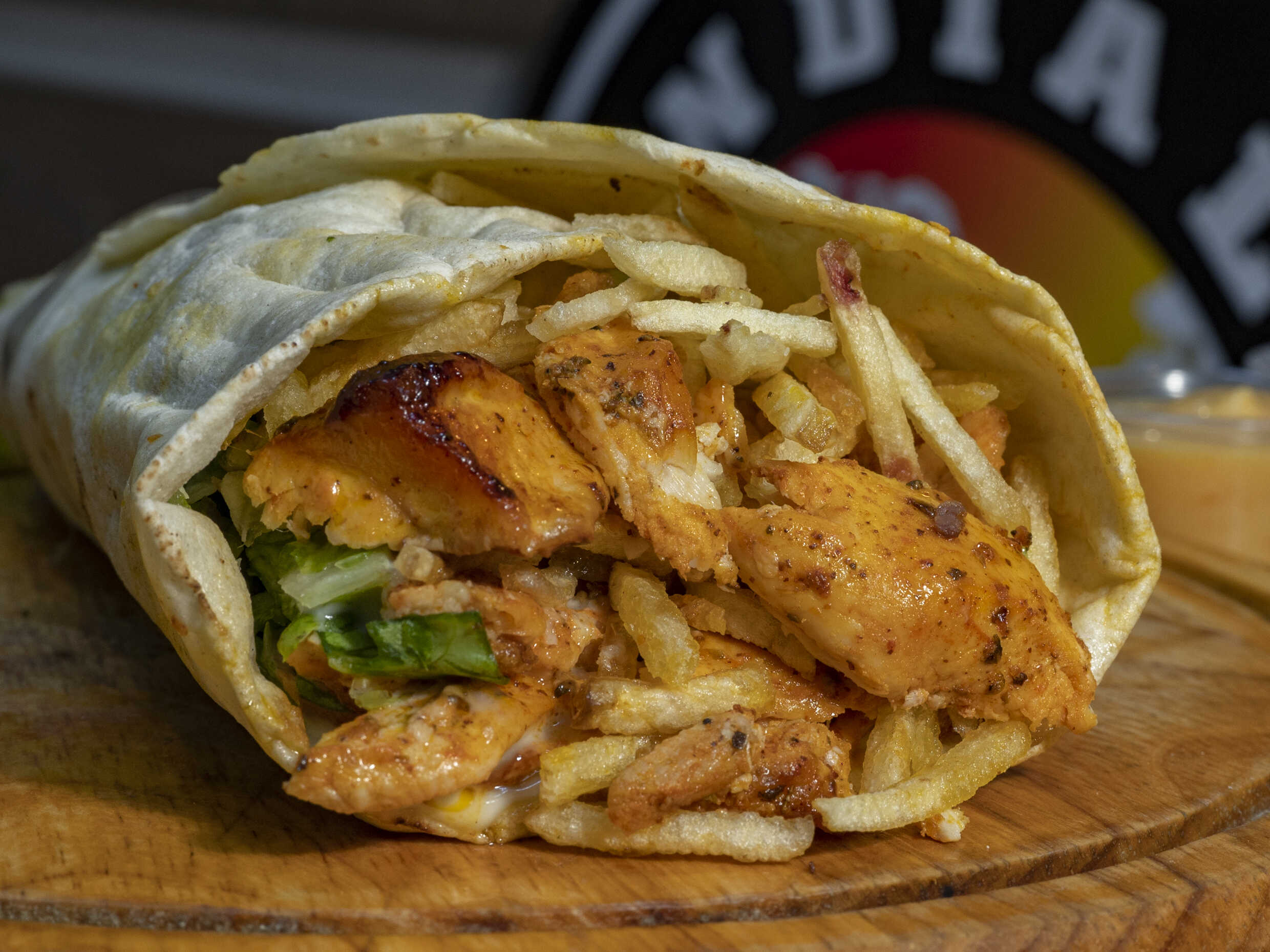 Shawarma con trozos de pollo, papitas al hilo, ensalada y salsa de ajo y pimiento caramelizado
