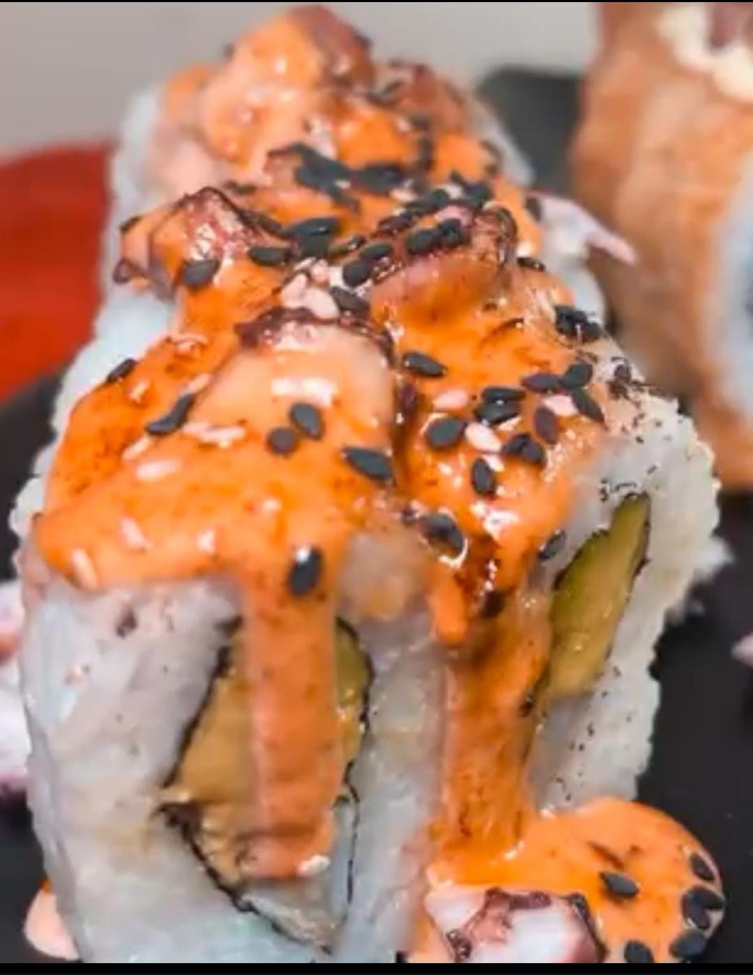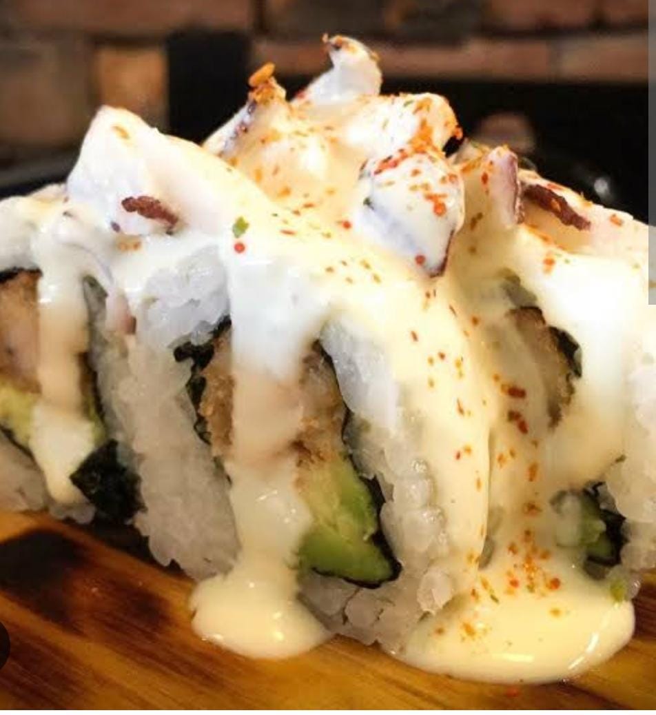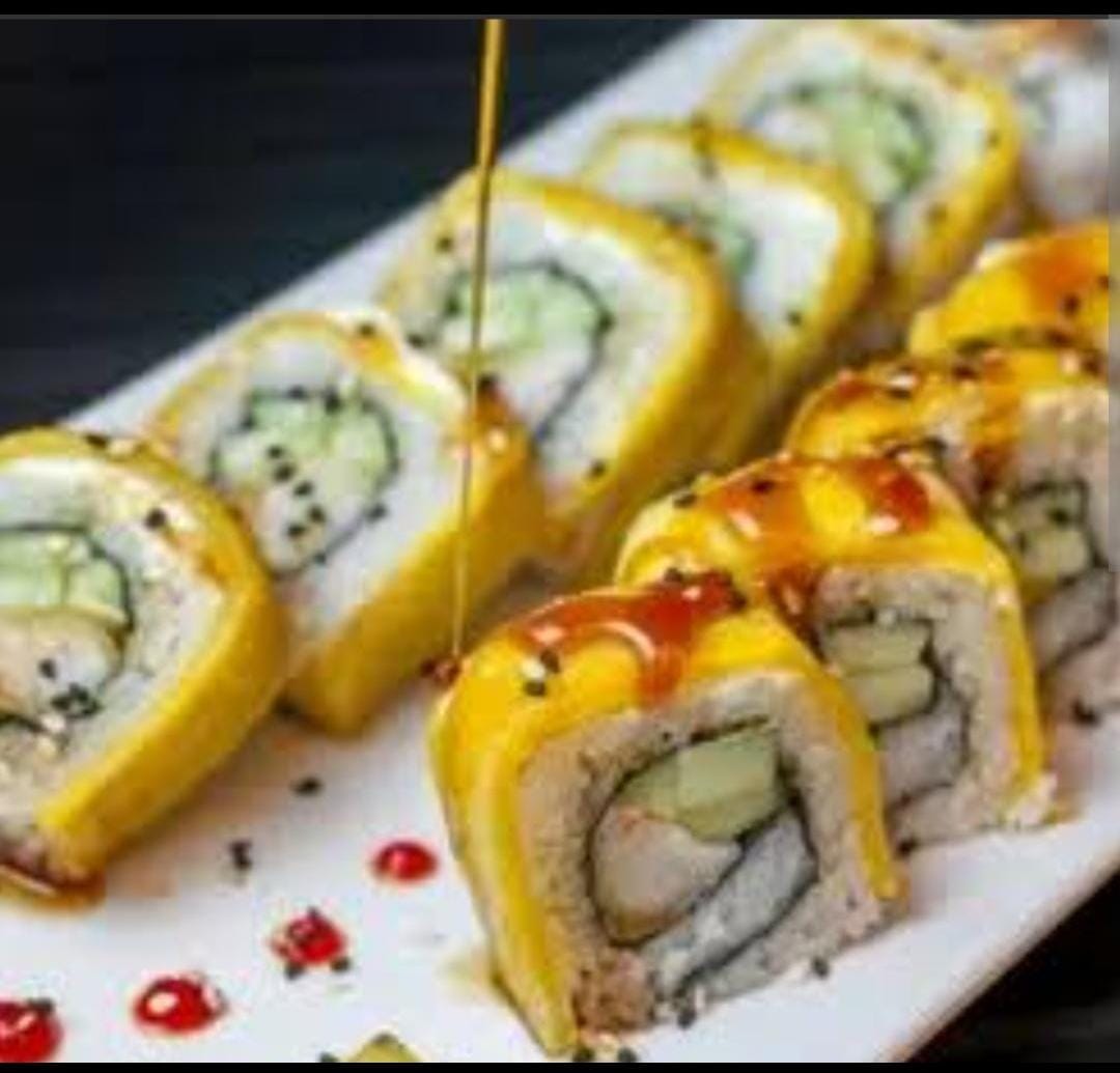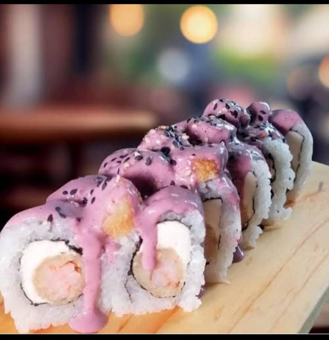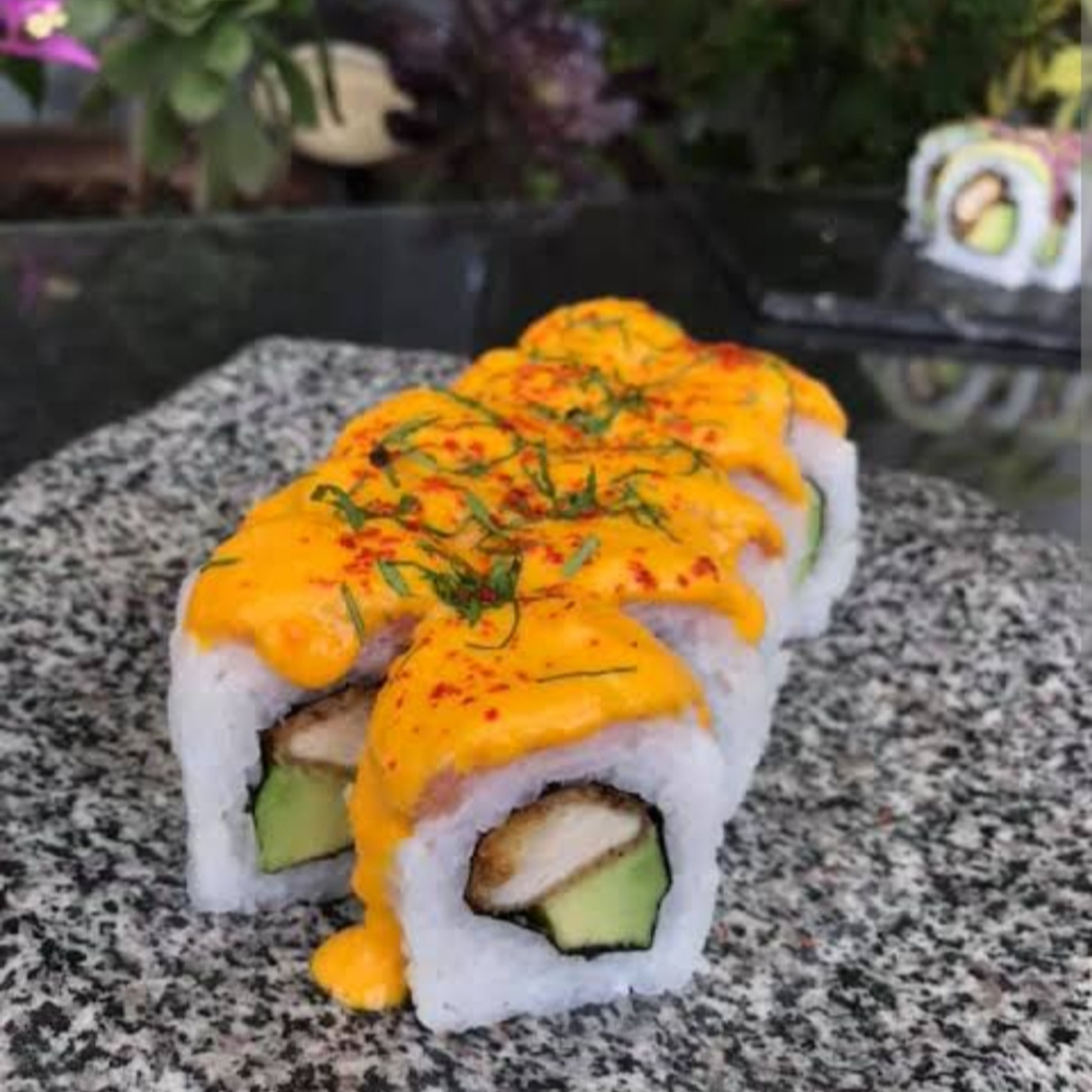 Tiradito roll palta y pescado furai bañado en tiraditos.