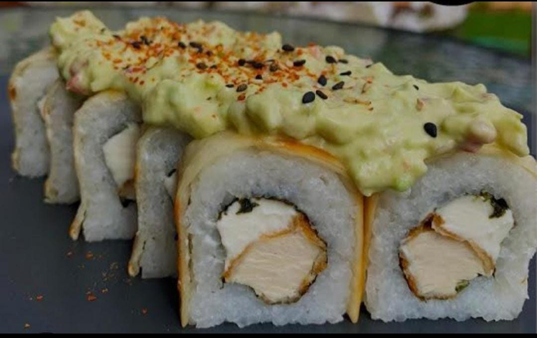 Guacamole (Frito) palta y pescado furai cubierta de salsa de guacamole.