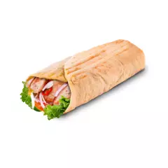Pan árabe con pollo crispy, jamón, salsa pizza, queso mozzarella, pimiento, cebolla tomate y cremas a elección.