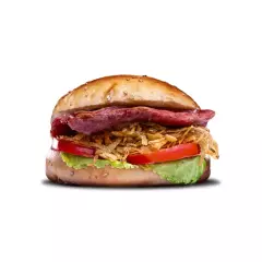 Hamburguesa de soya con champiñones, lechuga, palta, tomate, papas al hilo y cremas a elección.