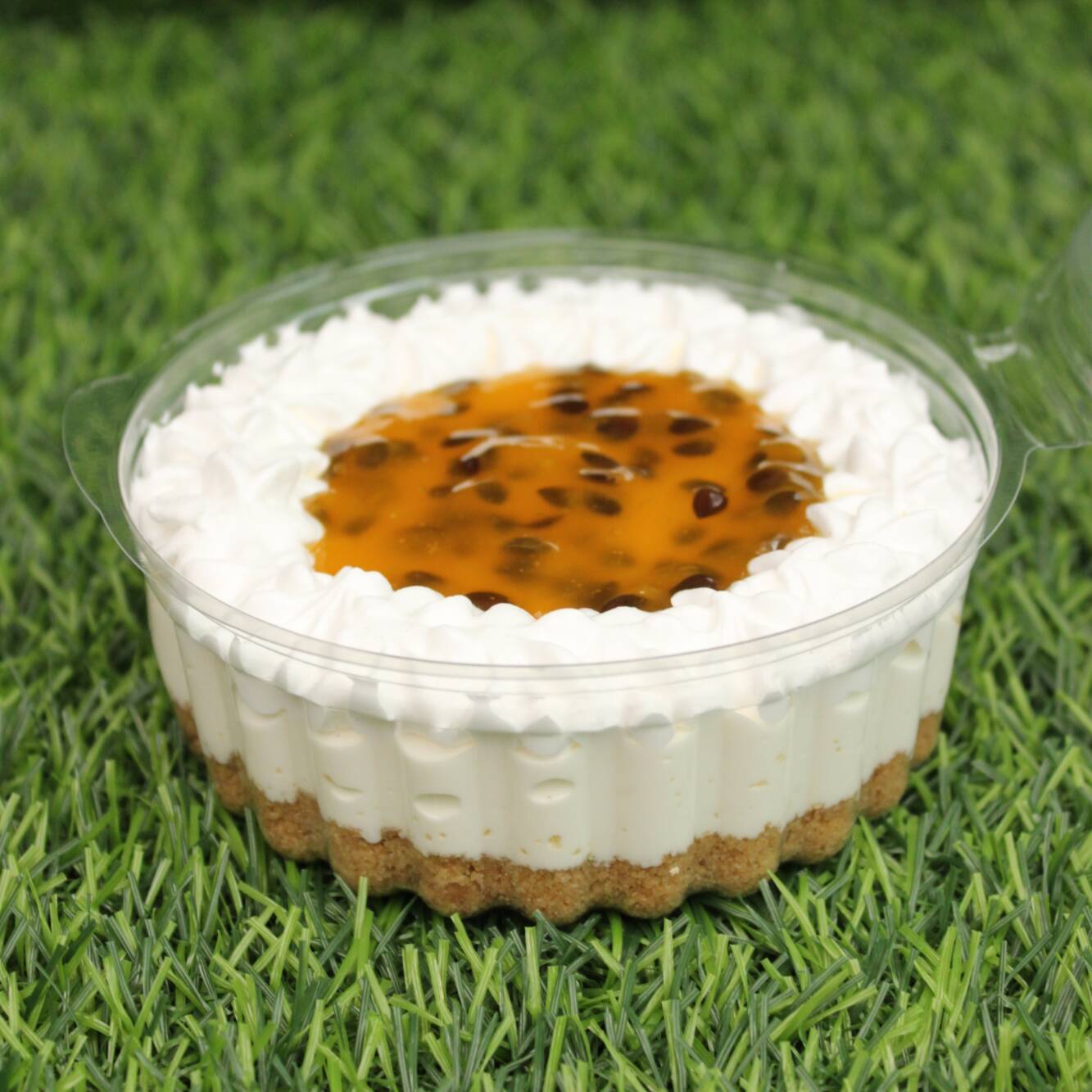 Base de galleta de vainilla con cremoso relleno de queso crema, decorado con esencia de maracuyá.