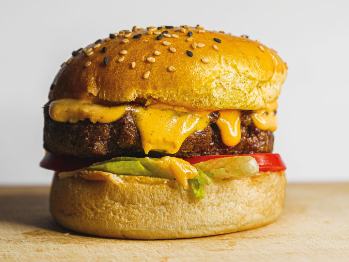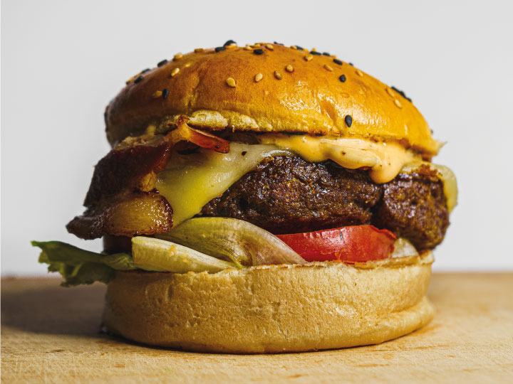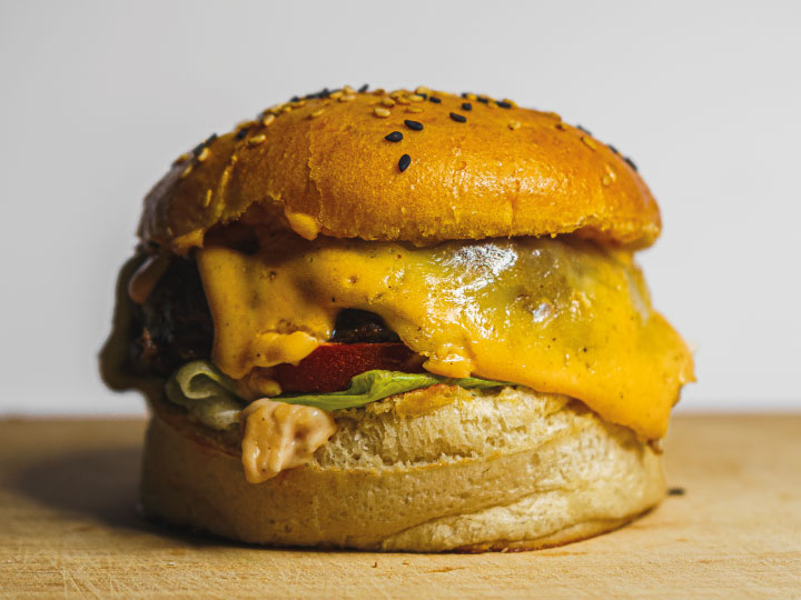 Hamburguesa de 200 gr. doble queso dambo, huevo, lechuga tomate y salsa especial. Papa y camote de acompañamiento.