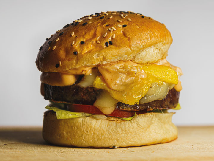 Hamburguesa de 200 gr. queso dambo, lechuga tomate y salsa especial. Papa y camote de acompañamiento.