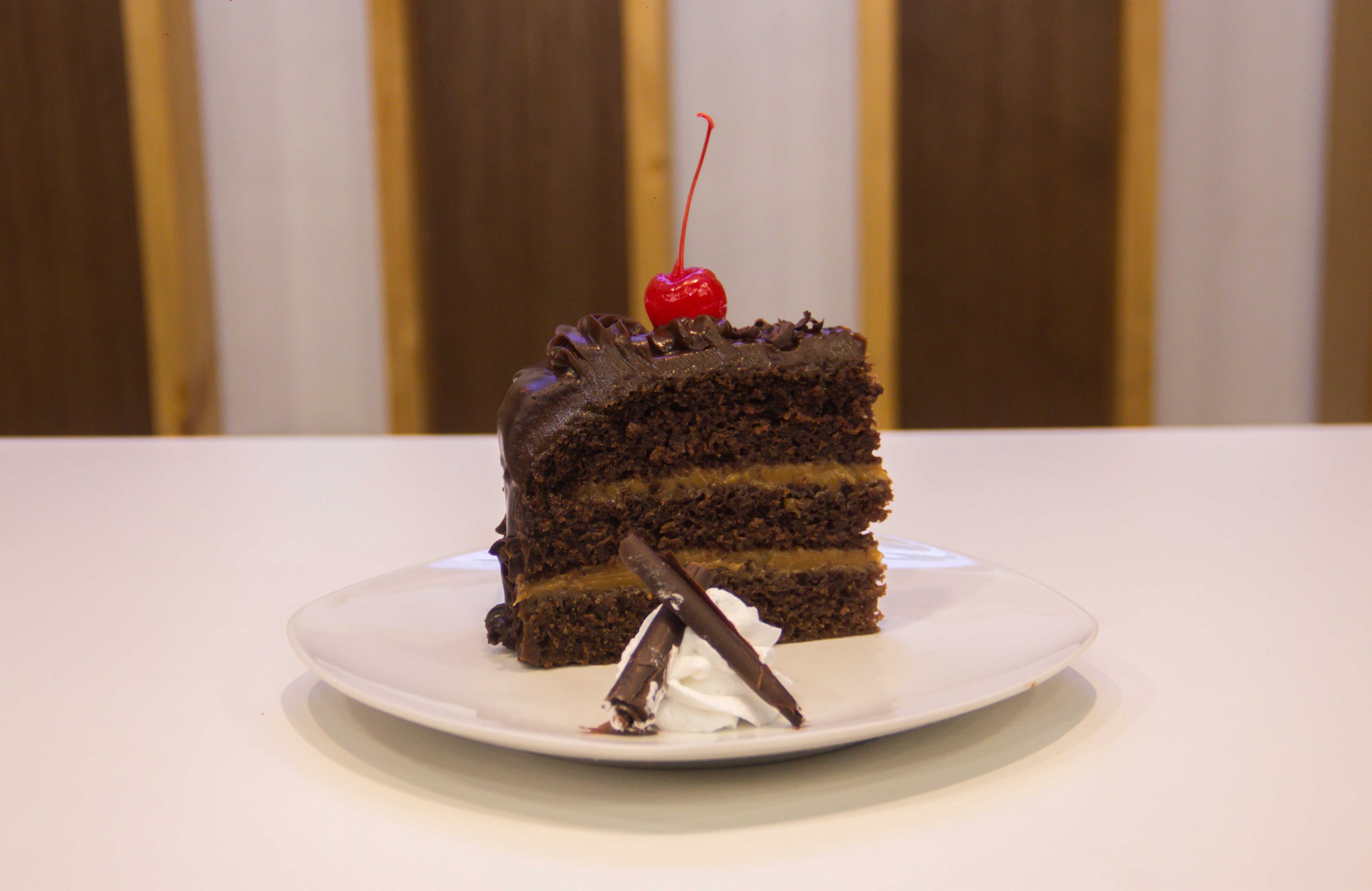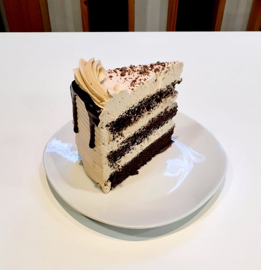 Bizcochuelo húmedo de chocolate con doble capa de relleno de crema de café con chocolate y un toque de pisco.