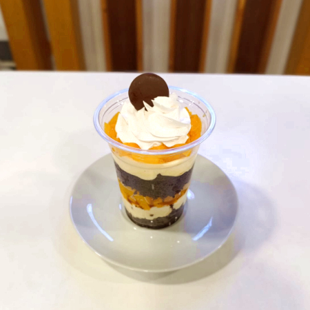 Vaso de 12 oz Keke de chocolate húmedo, crema diplomática con trozos de durazno picadas