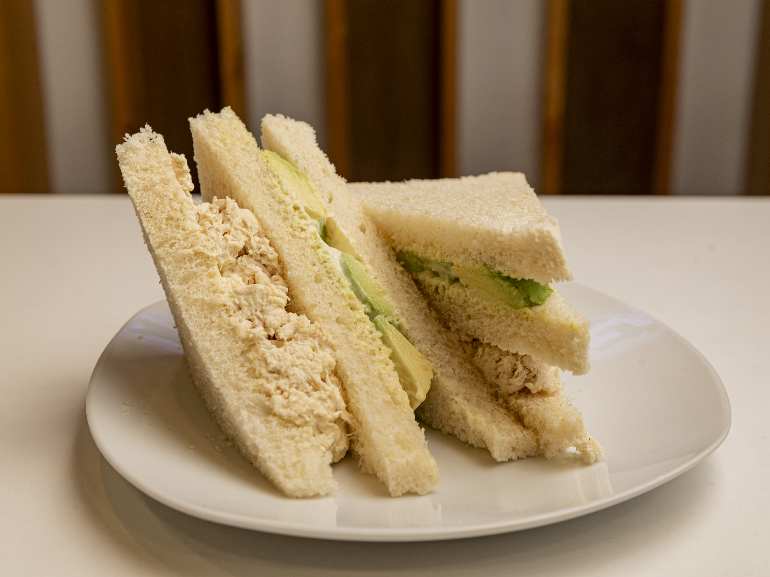 3 Tajadas de pan pullman huntadas con mayonesa casera, pollo deshilachado y palta en gajos.