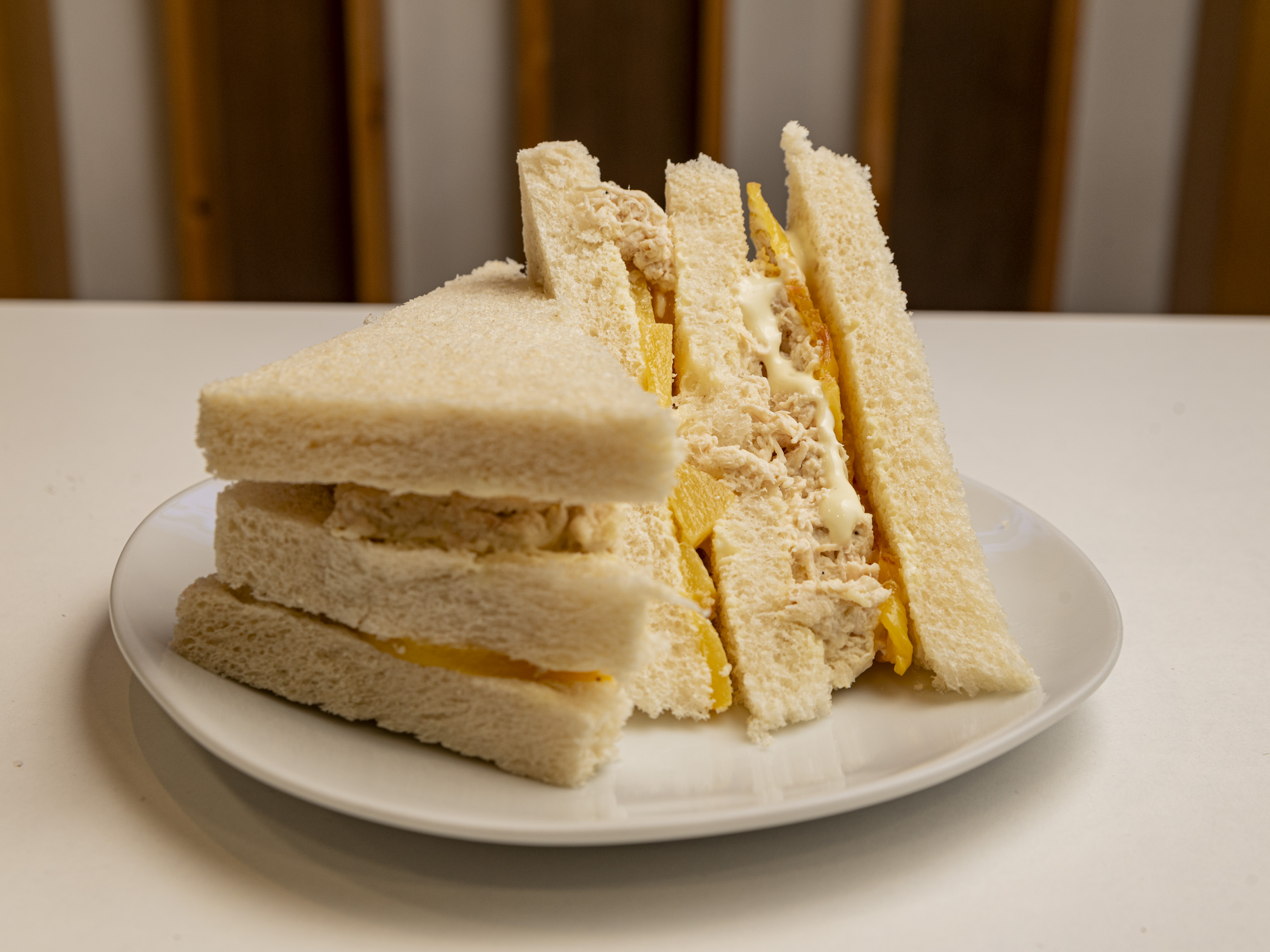 3 tajadas de pan pullman huntadas con mayonesa casera, pollo deshilachado y trozos de durazno en conserva .