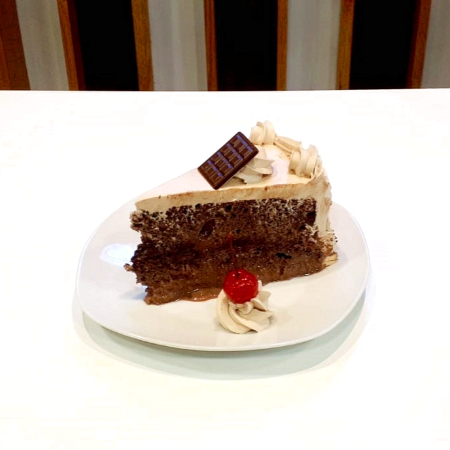 1 porción bizcochuelo de chocolate embebido de tres leches y cocoa decorado con chantilly de chocolate.