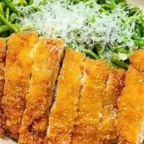 Salsa pesto , parmesano , pollo al panko