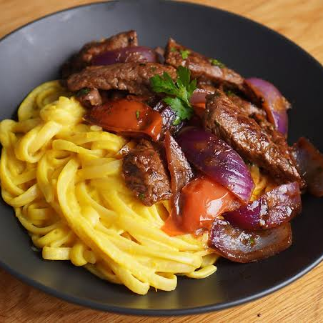 Lomo fino con fetuccini huancaina