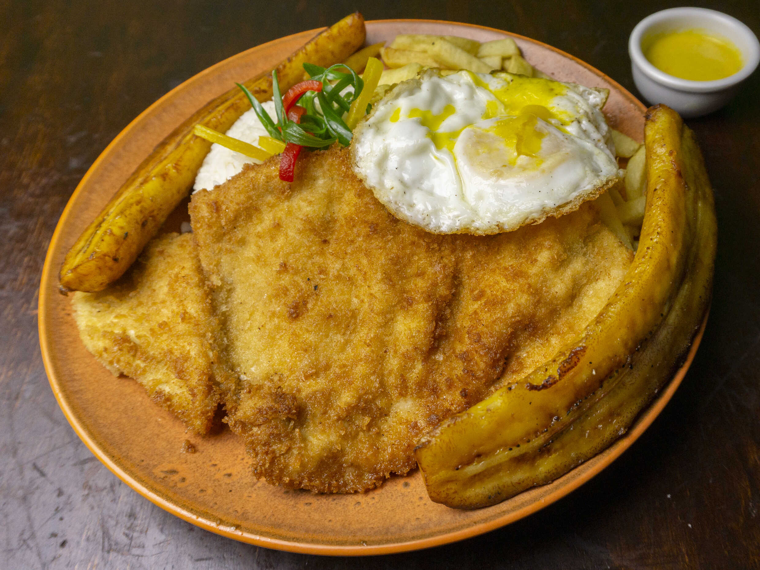 Milanesa con arroz, plátano, huevo y papas.