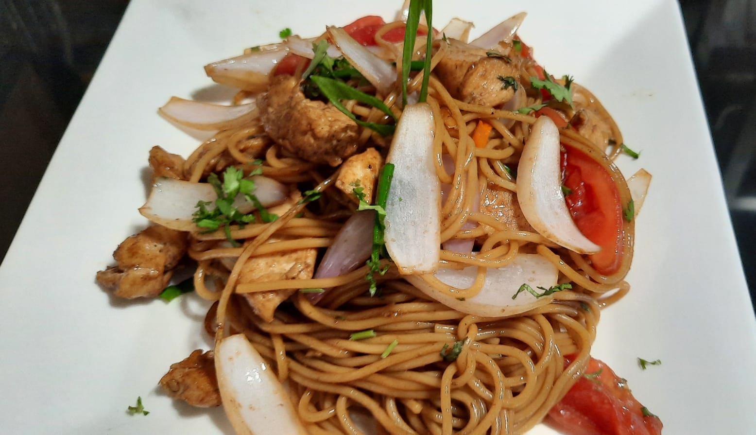 Tallarín salteado con pollo, cebolla china, cebolla.