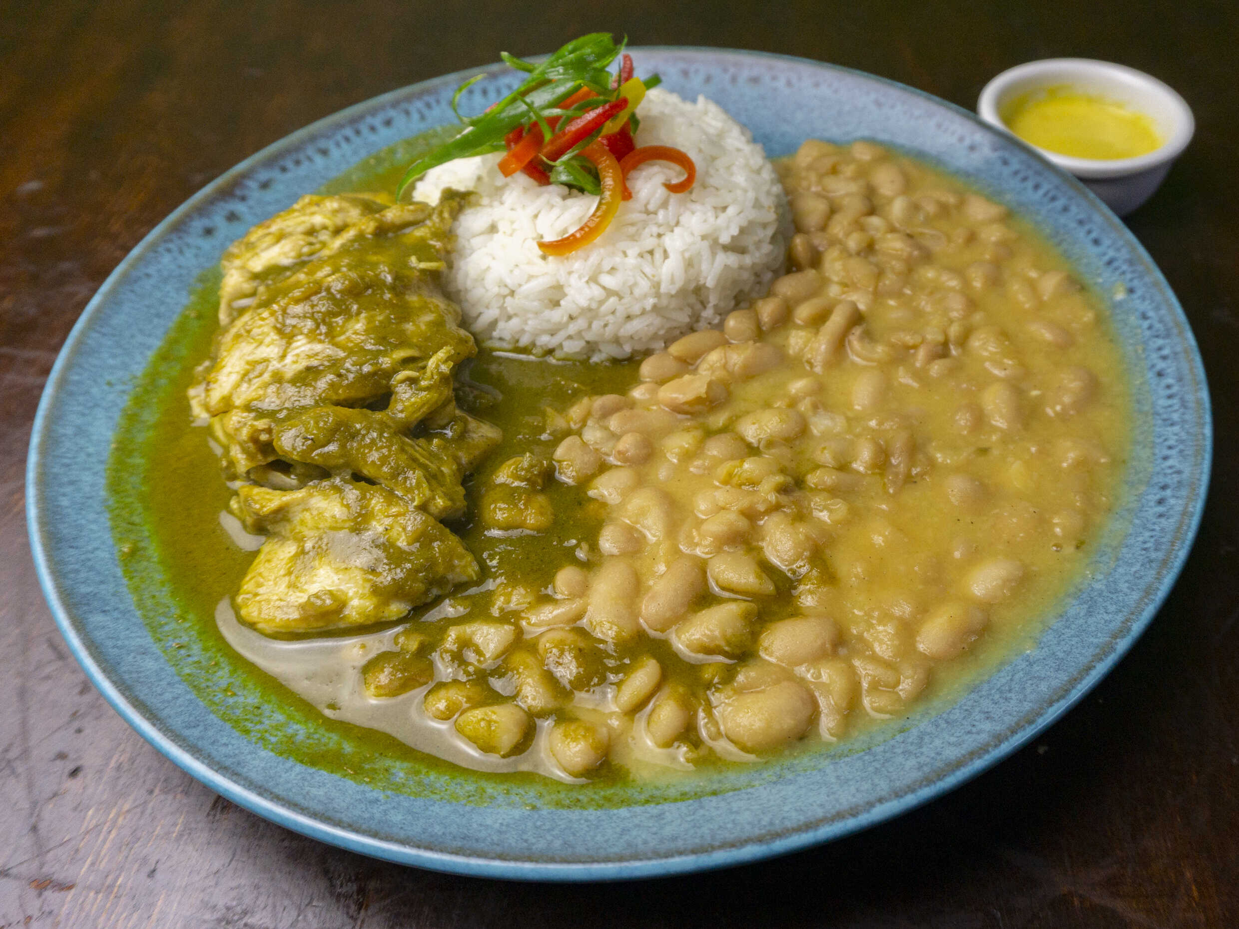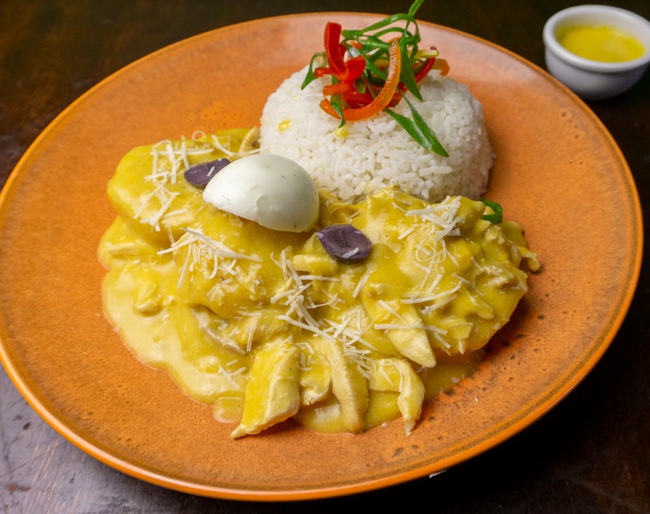 Arroz, ají de gallina, pollo, crema de leche y papas.