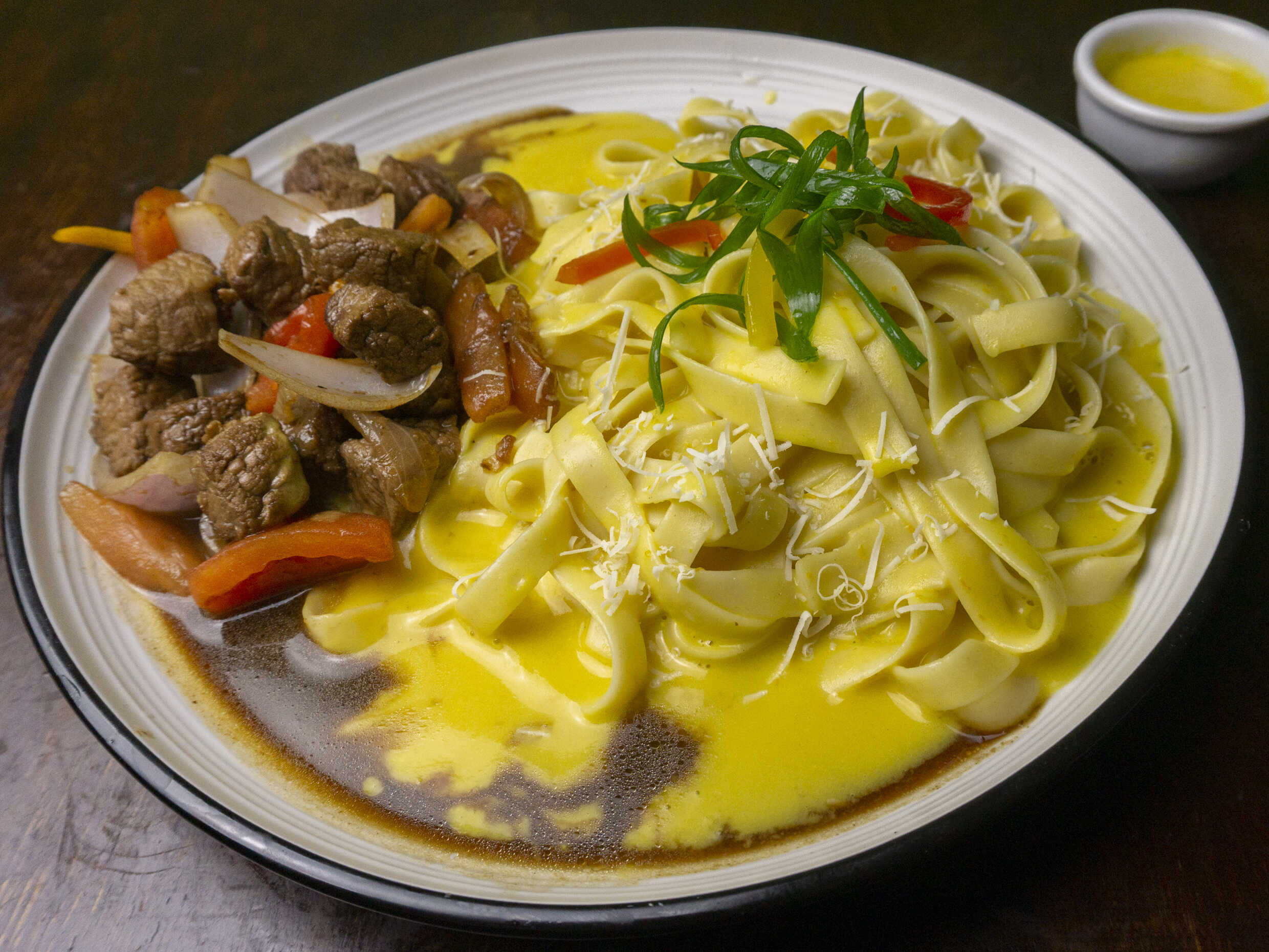 Fetuccini a la Huancaína con Lomo saltado