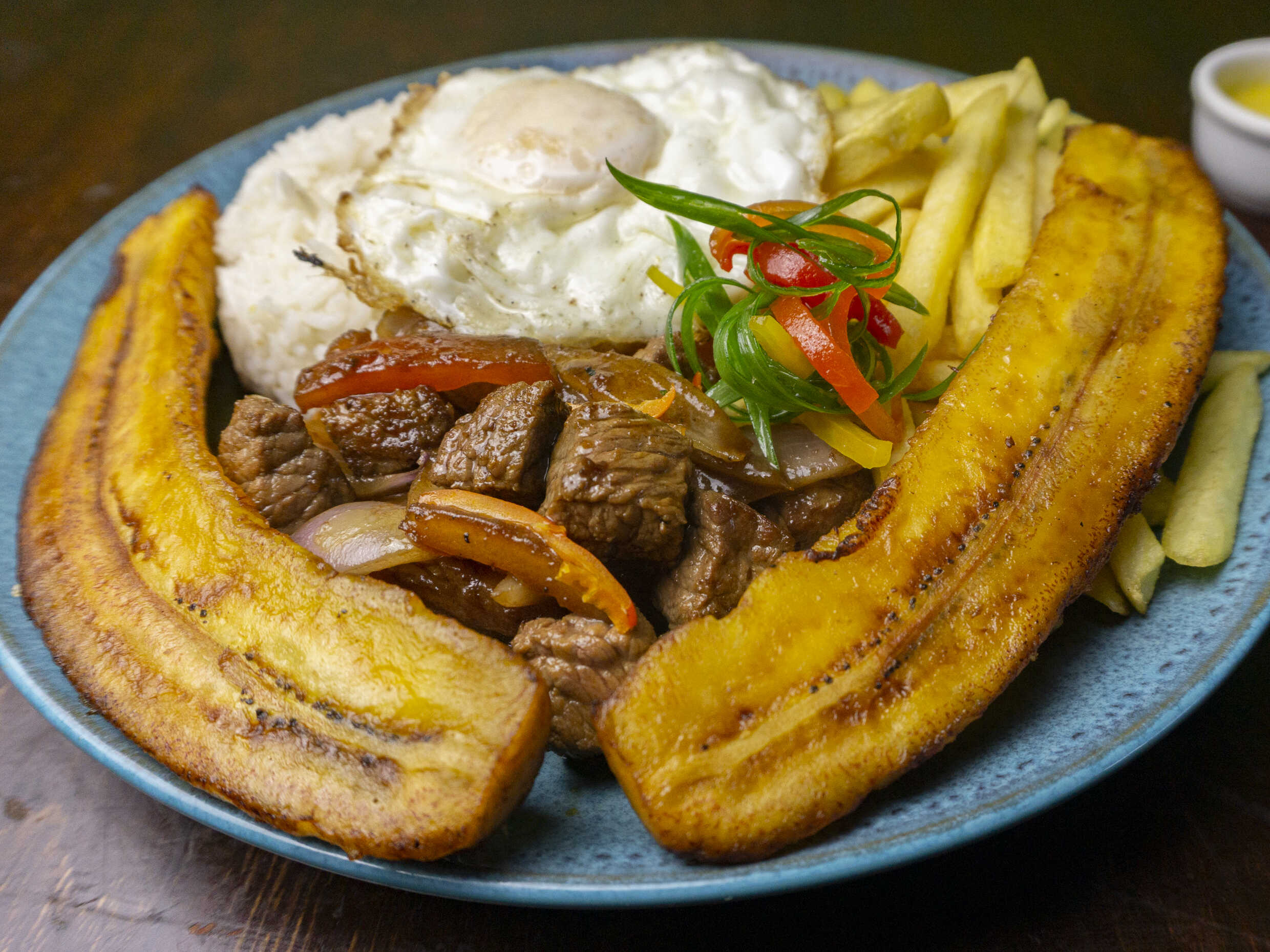 Lomo a la parrilla, arroz, huevo y papas.