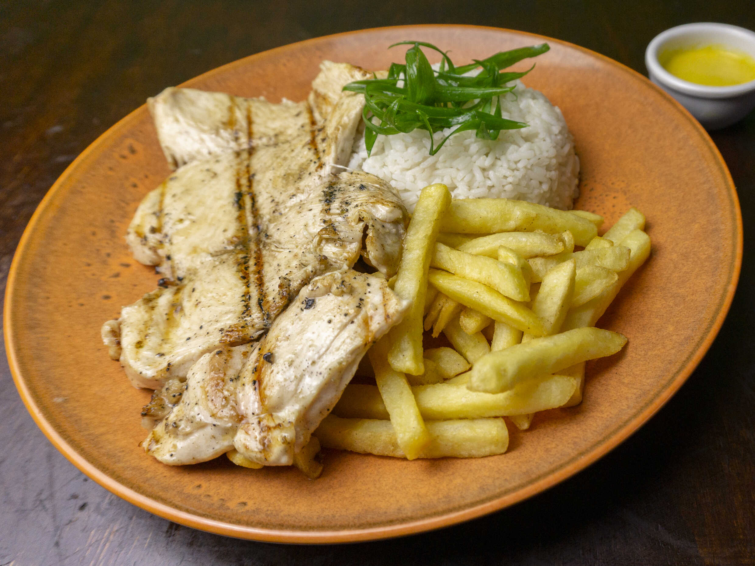 Pechuga a la parrilla, papas fritas, ensalada.