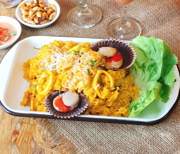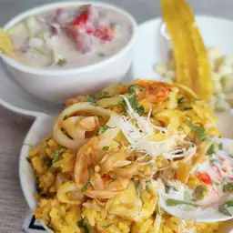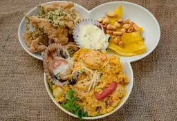 Dúo: Arroz con mariscos más chicharrón de pescado.
