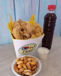 Box de chicharrones de pescado acompañado con tártara y cancha y 355 ml chicha morada artesanal