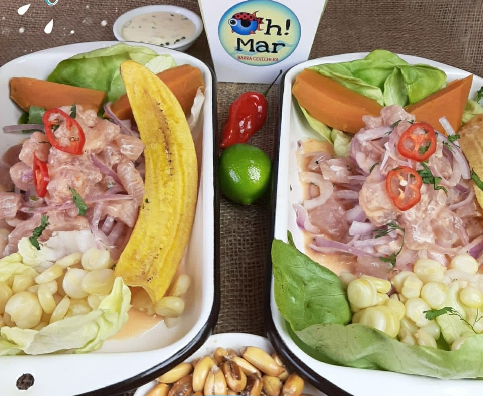 Dúo: ceviche de pescado y chicharrones de pescado.