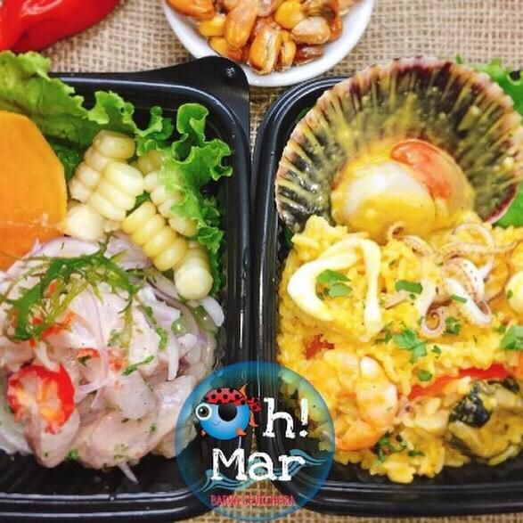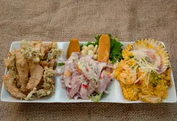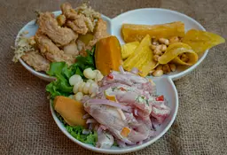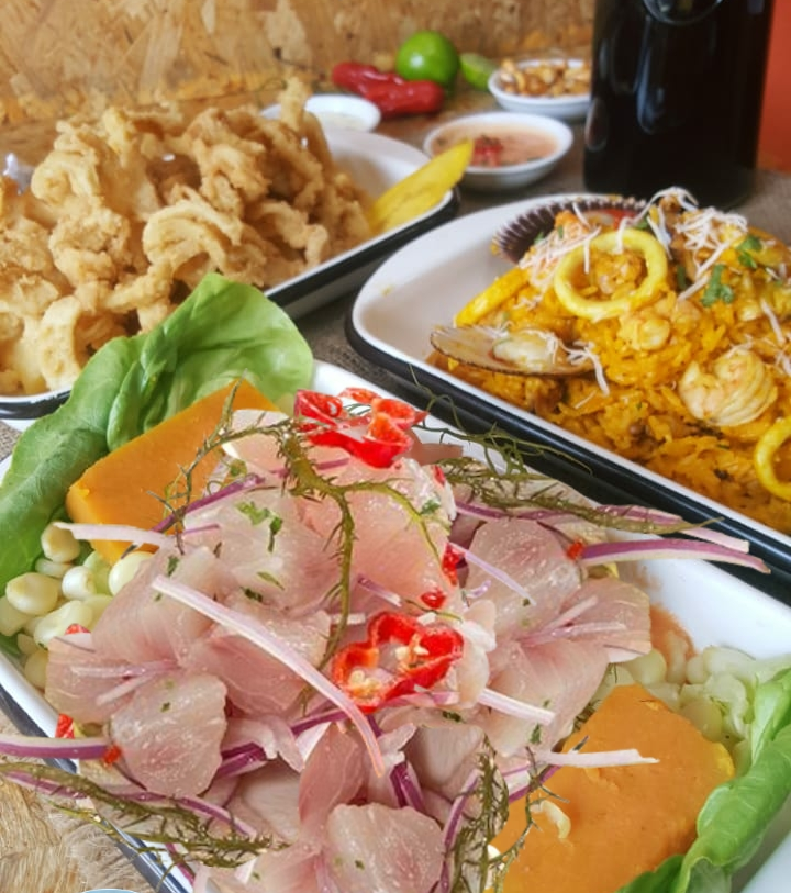 Ceviche de pescado, arroz con mariscos, chicharrón de pota, equivalente a 3 tríos acompañado con 1 litro de chicha.