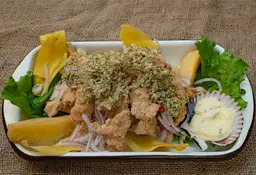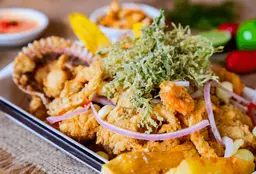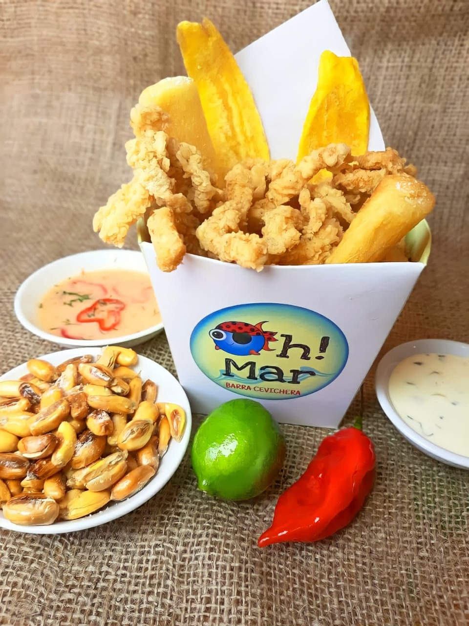 Sabrosos chicharrones de pescado y marisco seleccionados, acompañados de yuca fritas, yuyo arrebozado, chifles y salsa tártara.
