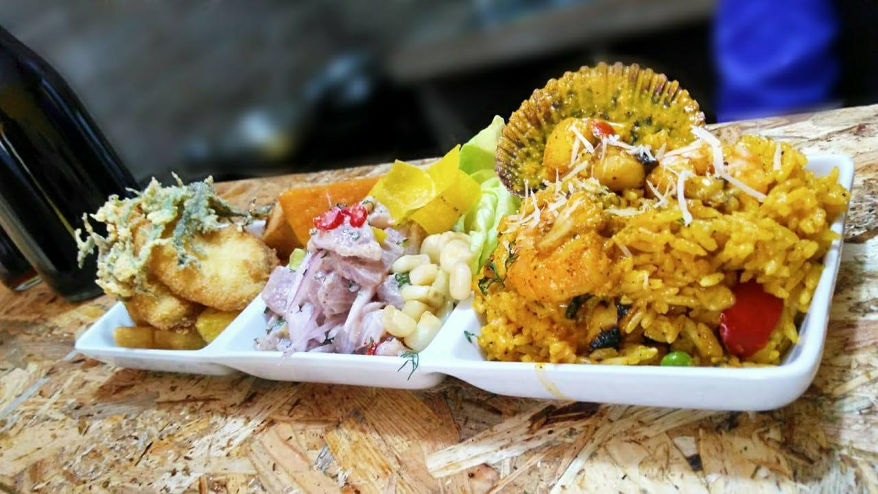 Trío: ceviche de pescado, arroz con mariscos y chicharrones de pescado.